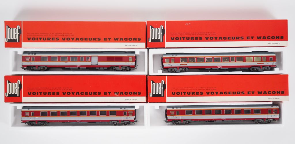 Matériel roulant en HO de marque Jouef en boites d’origines lot de 4 voitures grand confort réf 5341/41/42/43 BE d’usage