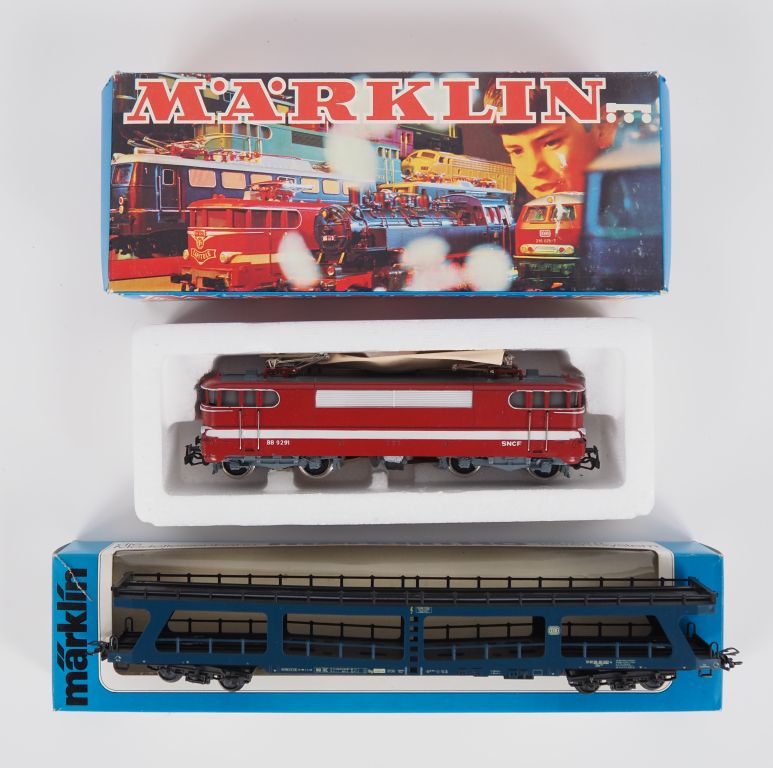Matériel roulant en HO de marque MARKLIN en boites d’origine lot comprenant motrice BB9291 SNCF capitole réf 3038 et wagon transport de voitures réf 4234 BE d’usage