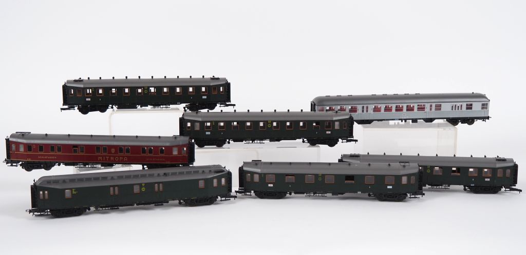 Matériel roulant en HO de marque ROCO lot de 7 voitures voyageurs dont 5 voitures réseau allemand (mitropa)+ fourgon a bagage et voiture banlieue DB BE d’usage