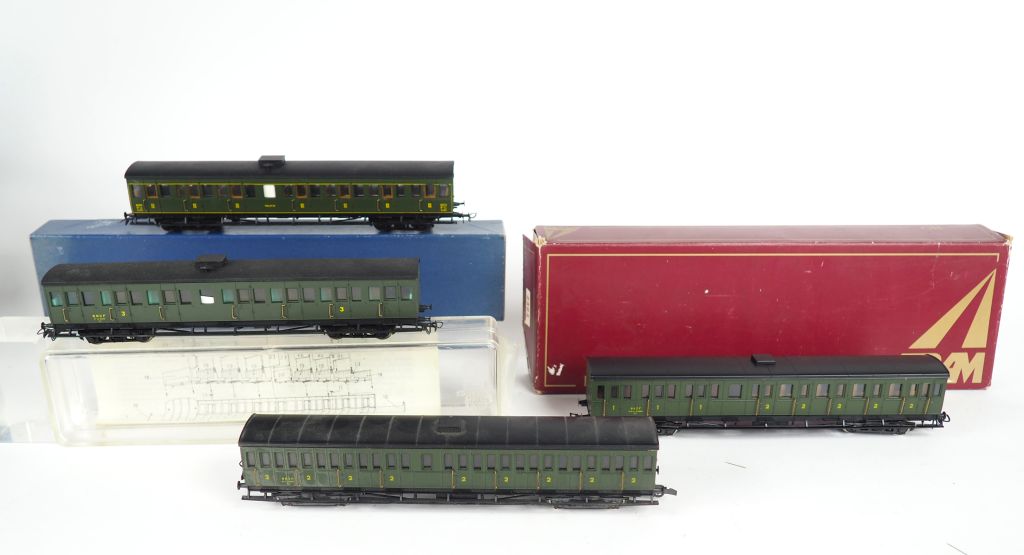 Matériel roulant France Train et TRAM lot comprenant une voiture France train SNCF 3eme classe on y joint une voiture Nord Kit monté dans sa boite 123 , une voiture SNCF sans boite , et TRAM 1er et 2eme SNCF dans sa boite BE d’usage