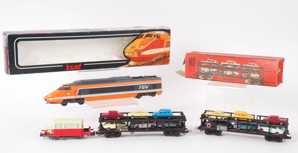 Matériel roulant HO de marque JOUEF lot comprenant motrice TGV en boite, deux portes voitures avec chacun 6 voitures dessus années 1960, une draisine en état d’usage