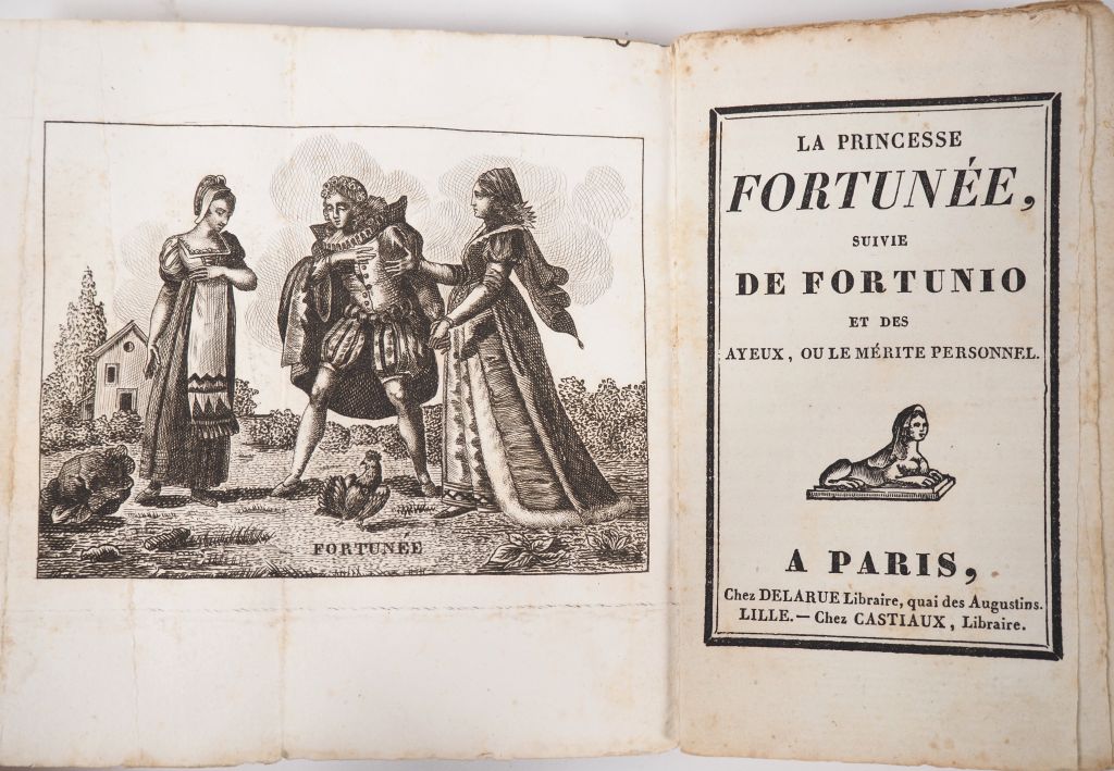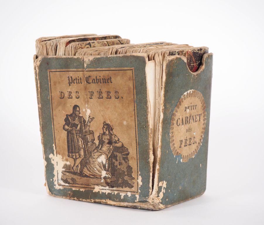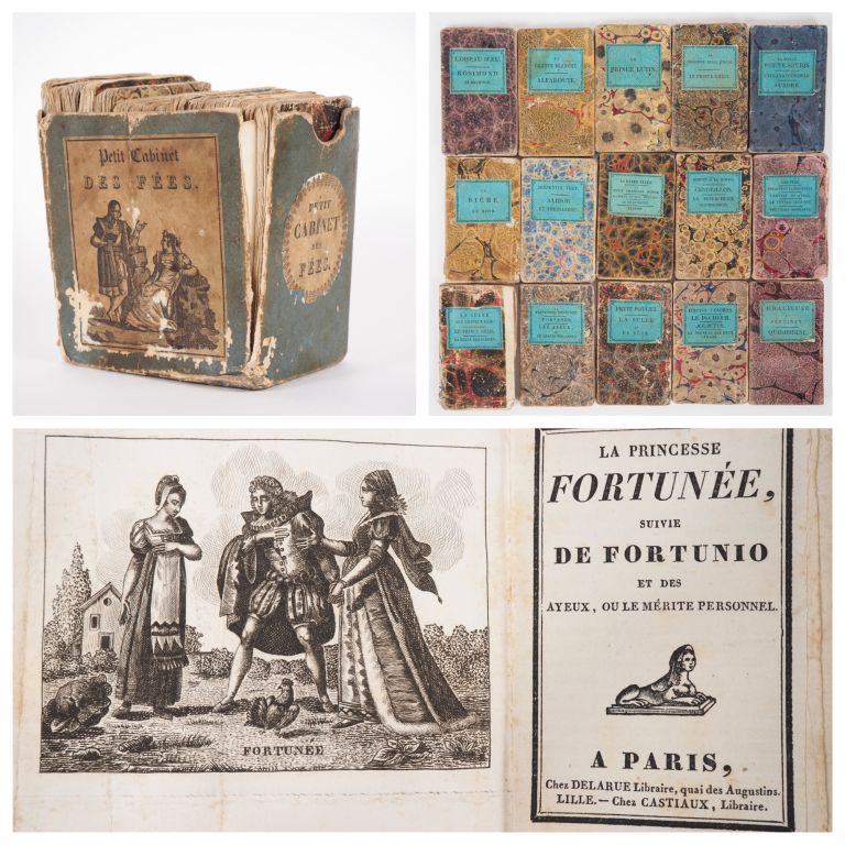 Petit cabinet des fées Paris chez Delarue librairie quai dens Augustins Lille chez castiaux librairie Lille imprimerie de Bloquel 1810 15 volumes de 11 cm recouvert de papier marbré avec le titre sur un papier bleu conditions usagées avec quelques traces d’humidités et taches des pages mais chaque volume contient sa gravure une gravure a été recousue a l’envers, le tout dans un emballage cartonné d’époque avec gravures, en mauvais état… Expert : Murielle Auffret