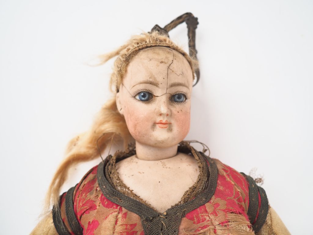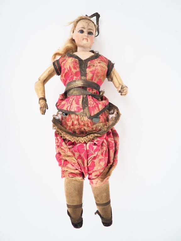 Poupée de fabrication française circa 1880 de marque FG, tête porcelaine, corps en chevreau blanc. Costume à la turque. Dim.41 cm (tête accidentée, état d'usage).
