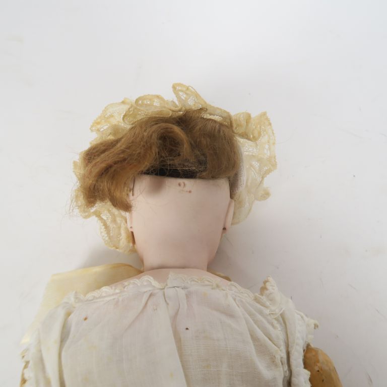 Poupée dite parisienne tête porcelaine de marque Gautier marquée 2, la bouche est fermée, les yeux fixes sont en émail bleu, la tête présente une décoloration au front, la collerette en porcelaine paraît en bon état, le corps composition articulé en bois avec les mains et avant-bras en porcelaine présentent un accident avec recollage à une main, le vernis et la peinture du corps en bois sont en mauvais état, la poupée fait 40 cm, sous-vêtement et corset ancien taille 40 cm