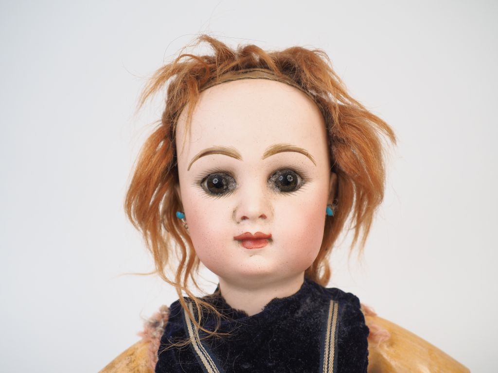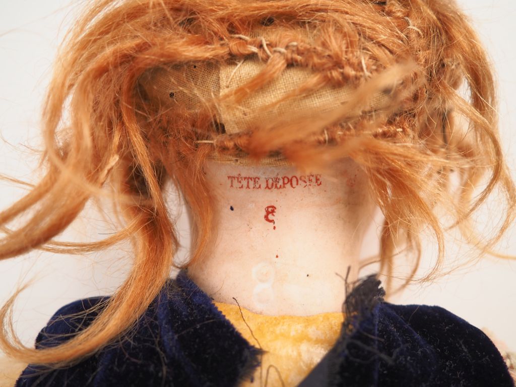 Poupée française circa 1890, tête porcelaine de fabrication Paris bébé, bouche fermée, yeux de sulfure brun, perruque en mohair, corps articulé en composition, d'origine et marqué à la Tour Eiffel, tête marquée du tampon rouge déposée 8. Dim. 46 cm ( perruque dégradée, état d'usage).
