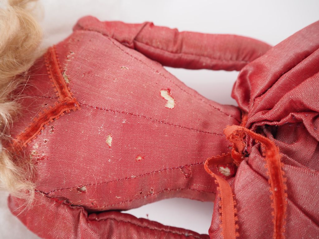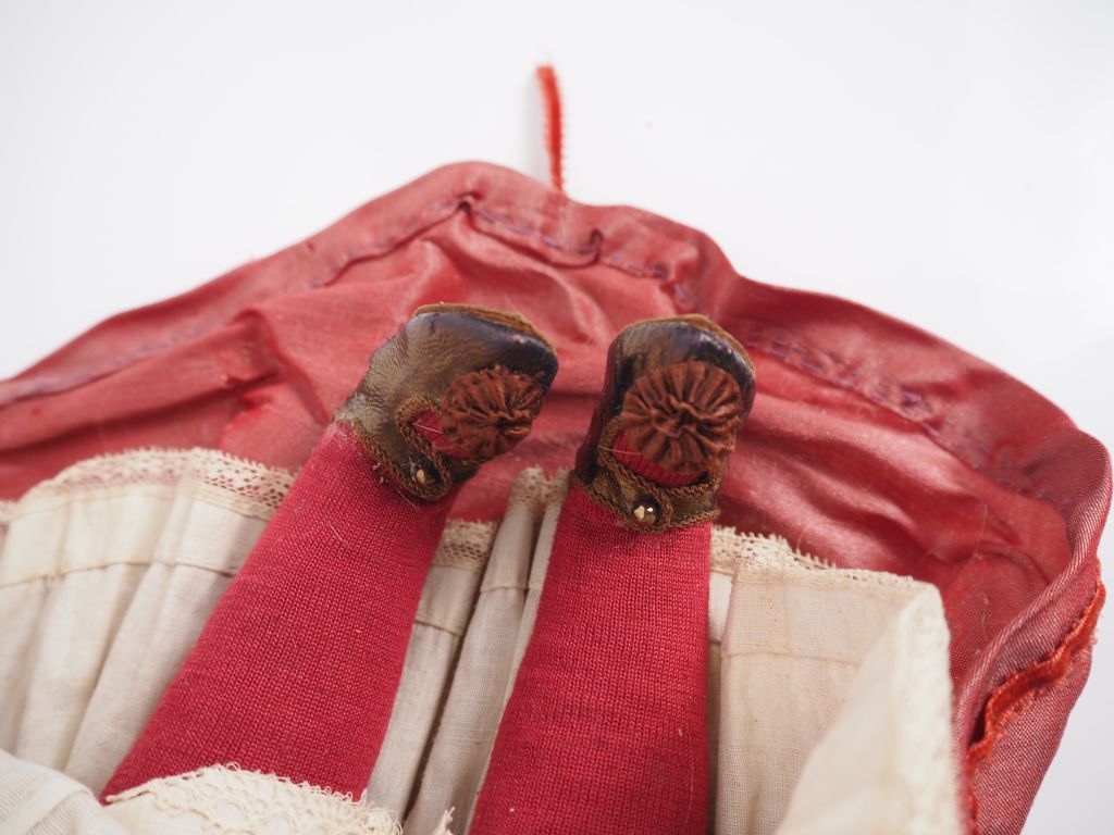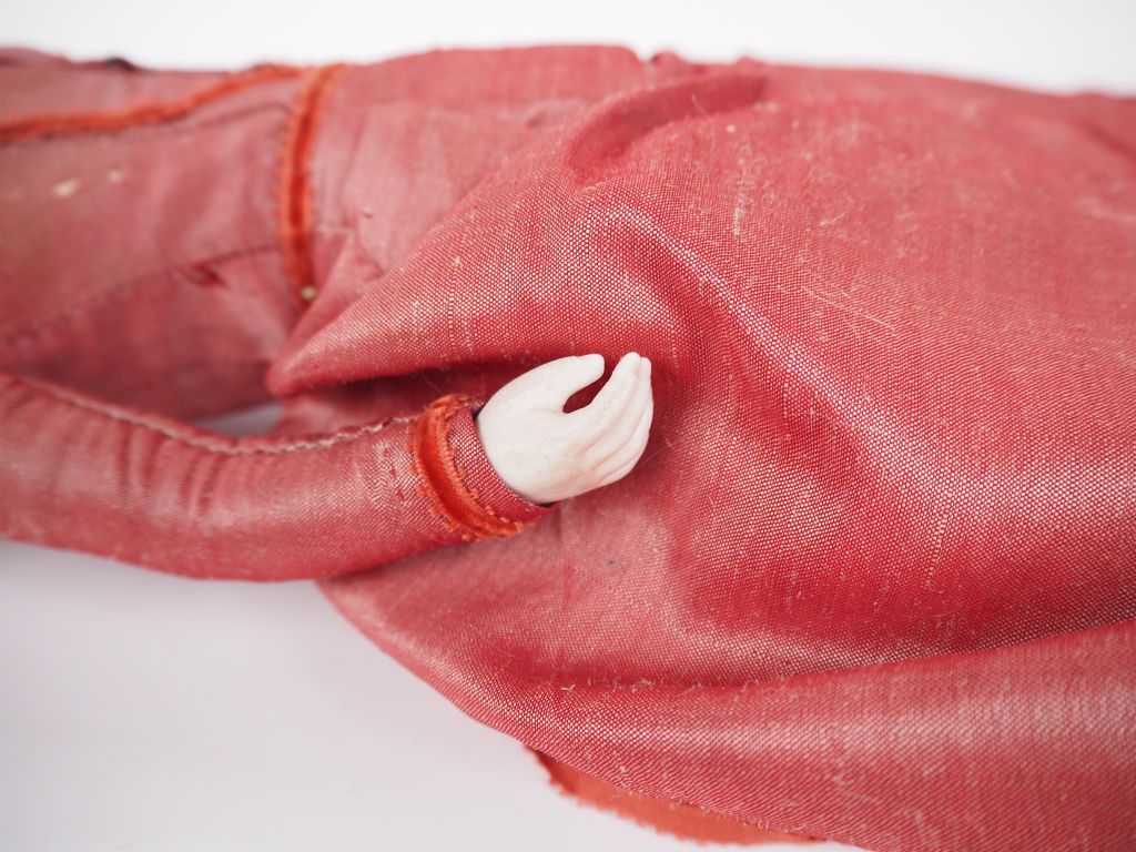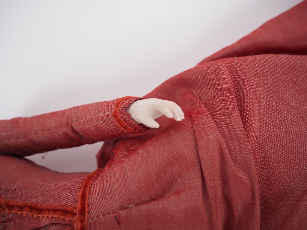 Poupée parisienne avec une tête pivotante sur buste en porcelaine sans marque yeux fixes bleu cobalt, corps de tissus bourré raide aux mains de biscuit en parfait état, chaussures de bébé E.J taille 5 at vêtement anciens en état d’usage 45 cm Expert : Murielle Auffret