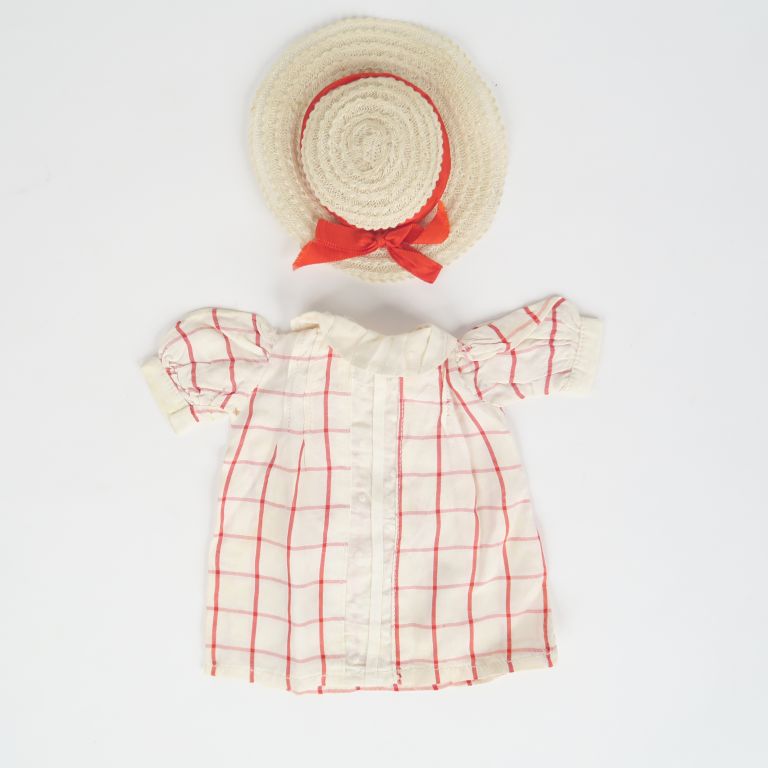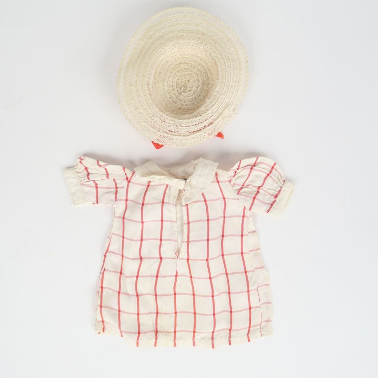 Vêtements Gauthier Languereau en bel état d'usage « fillette » de 1936 manque la ceinture de cuir rouge. On y joint une très jolie capeline blanche en paille à nœud rouge
