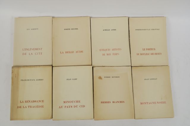 A LA PORTE D'AUDE. Collection d'Ecrivains Audois. Carcassonne, Editions d'Art Jordy s.d. (Ca 1930). – ALIBERT (François-Paul). La Renaissance de la Tragédie. – STROWSKI (Joseph-Fortunat). Le Porteur du Rouleau des Morts. – MENGUE (André-Adrien). L'Offrande à la Lumière. – CAMP (Jean). Minouche au Pays du Cid. – MISTLER (Jean). Triomphe de Paris. – LEBRAU (Jean). Montagne Noire. – SENTENAC (Paul). Figures et Paysages d'Occitanie. – BARRIÈRE (Marcel). Le Carnaval de Limoux. – DUCLOS (Henri). Corbières. – ALBERNY (Luc). L'Enlèvement de la Cité. – VALMIGÈRE (Pierre). Contes de Fées. – ASTRE (Achille). Quelques Artistes de mon Temps. – DELTEIL (Joseph). La Belle Aude. – GIROU (Jean). Profils Occitans. – CRÉMIEUX (Benjamin). La Grenouille et les trois Nourrices. – montagné (Prosper). Le Festin occitan. – REVERDY (Pierre). Pierres blanches, poèmes. 17 volumes in-8, brochés. Collection complète. Tous les textes sont en édition originale. Portraits en héliogravure en frontispice. Exemplaires du tirage sur Lafuma (dernier papier), sauf Mengue (1/10 Hollande), Alibert et Campe (1/35 sur Arches). Le livre de Delteil La Belle Aude est enrichi d'un envoi a.s. à une dame.