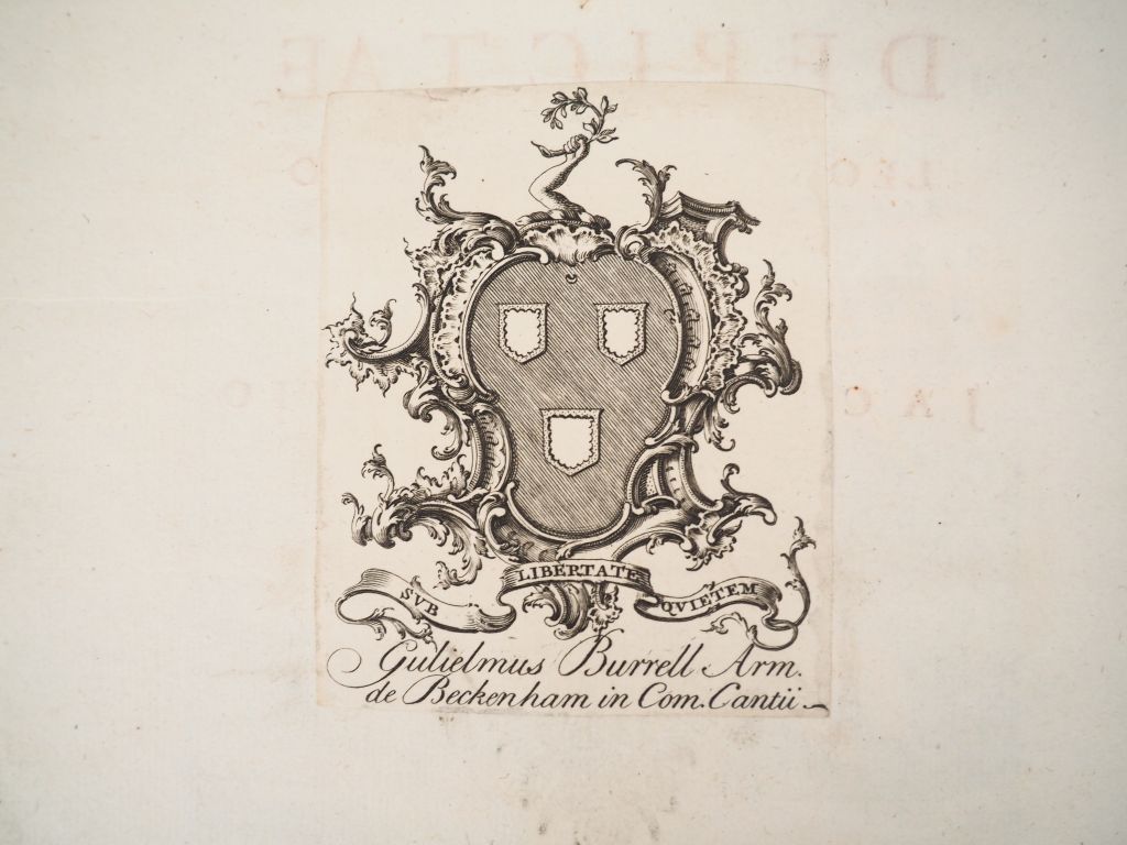 AGOSTINI (Leonardo). GEMMAE ET SCULPTURAE ANTIQUAE. Franequerae, Leonardum Strik, 1694. 2 parties reliées en un volume in-4 vélin rigide ivoire, plats décorés à froid d’encadrements et fleuron central, dos à nerfs orné de caissons et fers dorés, dont un fer « à l’aigle ? », pièce de titre noire, tranches mouchetées (Reliure de l’époque). SECONDE ÉDITION LATINE, publiée aux Pays-Bas, de l’œuvre de l’antiquaire toscan Leonardo AGOSTINI (1593-1676) qui consiste en la description (texte et planches) de pierres précieuses anciennes. Elle a été traduite de l’italien par Jakob Gronovius qui a ajouté une savante préface de 22 pages. L’ouvrage est illustré d’un FRONTISPICE gravé en taille-douce, de 4 PLANCHES dont un portrait d’Agostini, de 214 PLANCHES numérotées pour la 1ère partie et 51 PLANCHES numérotées pour la 2nde. TRÈS BEL EXEMPLAIRE, d’une rare fraîcheur, qui provient de la bibliothèque de l’antiquaire anglais Sir William Burrell (1732-1796), avec son ex-libris héraldique gravé « Gulielmus Burrell, Arm. De Beckenham in Com. Cantii ». ¶