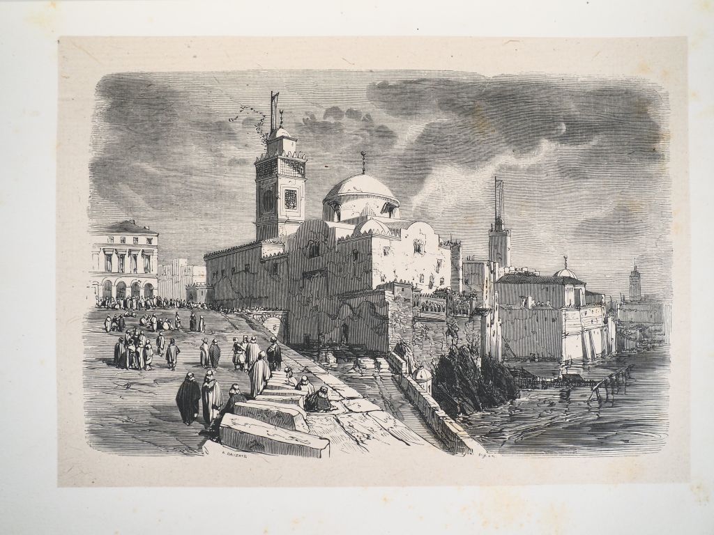 [ALGÉRIE]. NODIER (Charles). JOURNAL DE L’EXPÉDITION DES PORTES DE FER. Paris, Imprimerie Royale, 1844. Grand in-8 ½ chagrin vert, dos à nerfs orné, titre doré (Reliure de l’époque). Rousseurs éparses. ÉDITION ORIGINALE. Une CARTE dépliante de l'Algérie, de nombreuses vignettes sur bois dans le texte et 40 FIGURES sur bois h.-t. tirées sur chine et collées sur vélin fort sous serpentes légendées, par Raffet, Descamps et Dauzat. EXEMPLAIRE NOMINATIF avec la mention « A M. Chevarier / Maréchal des logis au 3e régiment des chasseurs d’Afrique » imprimée en tête de l’ouvrage. ¶ Tailliart, 1730 – Playfair, 1064 – Clouzot, 228 : « Important ouvrage »