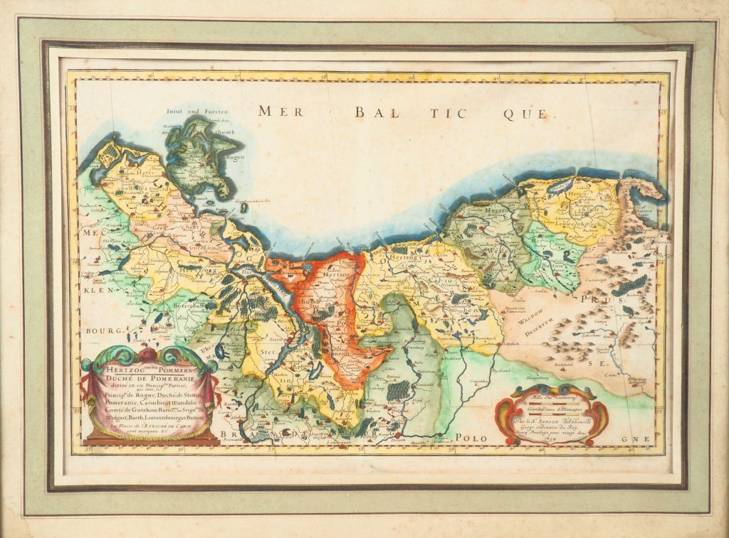 [ALLEMAGNE]. SANSON (N.). HERTZOG THUMB $OMMERN/DUCHÉ DE POMÉRANIE [et] BASSE-PARTIE DE LA BASSE-SAXE, où sont les Duchés de Sleswick, Holsace, Meckelenbourg, et Lanwenbourg. P., Sanson, 1654 - 1657. Deux cartes (50 X 32 cm et 52,5 X 38 environ) sous verre, cadre bois. Mouillure dans l’angle inférieur droit avec traces de moisissure à la 2nde carte. DEUX CARTES XVIIe GRAVÉES ET ENTIÈREMENT AQUARELLÉES.