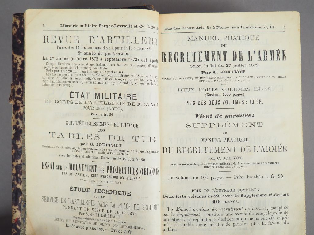 ANNUAIRE DE L’ARMEE FRANCAISE pour l’année 1874. Paris, Berger-Levrault. In-12. Reliure d’époque ½ basane, fil. dor. (accroc à la coiffe supérieure).