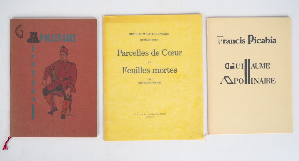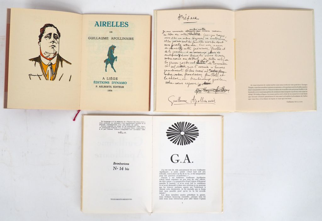 APOLLINAIRE (Guillaume). AIRELLES. Liège, Éditions Dynamo, P. Aelberts, 1954. In-12 broché. ÉDITION ORIGINALE. Illustrations coloriées de Raoul Dufy, Pablo Picasso, Auguste Mambour, Louis Marcoussis et Henri Matisse. Tirage limité à 51 exemplaires. UN des 10 numérotés sur vergé chiffon crème, enluminés à la main – PICABIA (Francis). GUILLAUME APOLLINAIRE. Lettre d’Apollinaire à F. Picabia. Liège, Éditions Dynamo, P. Aelberts, 1950. In-12 broché. ÉDITION ORIGINALE. Tirage limité à 51 exemplaires. UN des 40 numérotés sur vélin blanc – APOLLINAIRE (Guillaume). PRÉFACE POUR PARCELLES DE CŒUR ET FEUILLES MORTES par Georges Turpin. Gustave Arthur Dassonville, Bibliophile. In-12 broché. ÉDITION ORIGINALE. Tirage limité à 48 exemplaires numérotés sur vergé d’Arches. ENSEMBLE DE 3 OUVRAGES.