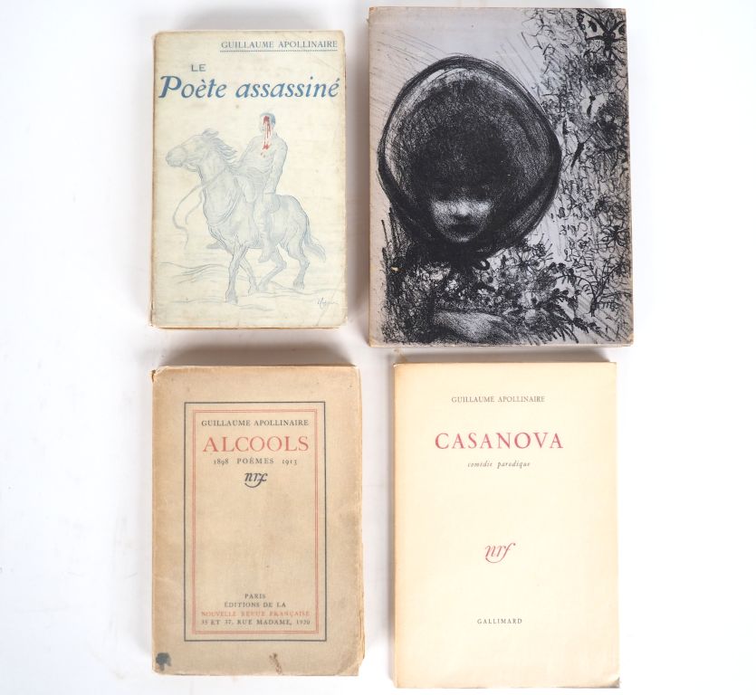 APOLLINAIRE (Guillaume). ENSEMBLE DE 4 OUVRAGES. LE POÈTE ASSASSINÉ. P., L'Édition, Bibliothèque des Curieux, [1916]. In-12 broché. Rousseurs au premier et dernier feuillets blancs. ÉDITION ORIGINALE sur vélin de l'édition (il n'a pas été tiré de grand papier). Le premier plat de la couverture est illustré par l'affichiste CAPPIELLO. Portrait de l'auteur en frontispice par André ROUVEYRE, daté mai 1916 – CASANOVA. P., Gallimard, 1952. In-8 broché. ÉDITION ORIGINALE. Tirage limité à 1736 exemplaires. UN des 1600 numérotés sur vélin labeur des Papeteries Navarre de Voiron. Exemplaire non coupé – ALCOOLS. P., Éditions de la Nouvelle Revue Française, 1920. Grand in-12 broché. Taches en marge inférieure du 1er plat. NOUVELLE ÉDITION – IL Y A. P., Éditions Grégoire, 1947. In-8 carré broché, étui cartonné illustré. ÉDITION ILLUSTRÉE par Édouard GOERG. UN des 1250 exemplaires numérotés sur vélin parcheminé.