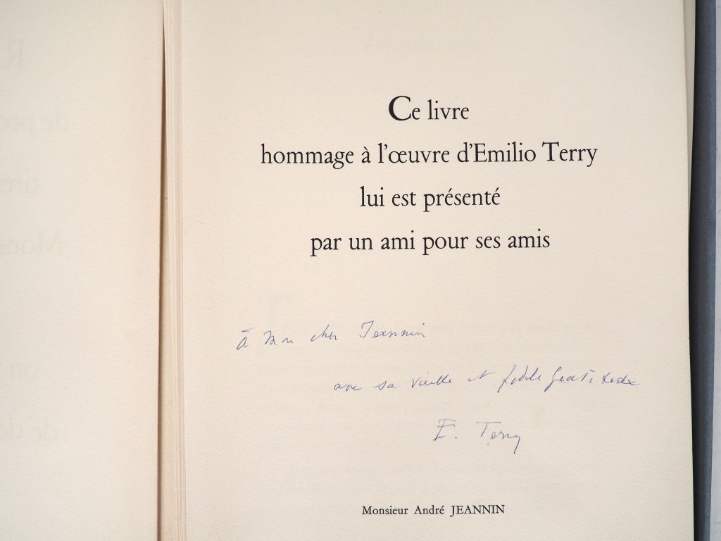 [ARCHITECTURE]. RECUEIL DE PROJETS D’ARCHITECTURE tirés des cartons de Monsieur Emilio Terry auxquels on a joint un choix de dessins d’ornements. S.l.n.e., 18 juillet 1969. Petit in-folio en ff., sous couverture à rabats et boite-écrin (partie supérieure fendue) , 84 pp., (3) ff. de table et achevé d’imprimer. Couverture brunie et roussie. ÉDITION ORIGINALE hors-commerce contenant de nombreux dessins et plans en noir et couleurs de l’architecte franco-cubain Émilio TERRY (1890 - décembre 1969), probablement tirée à petit nombre. Exemplaire nominatif avec ENVOI AUTOGRAPHE signé : « à mon cher [André] Jeannin / avec sa vieille et fidèle gratitude / E. Terry ».
