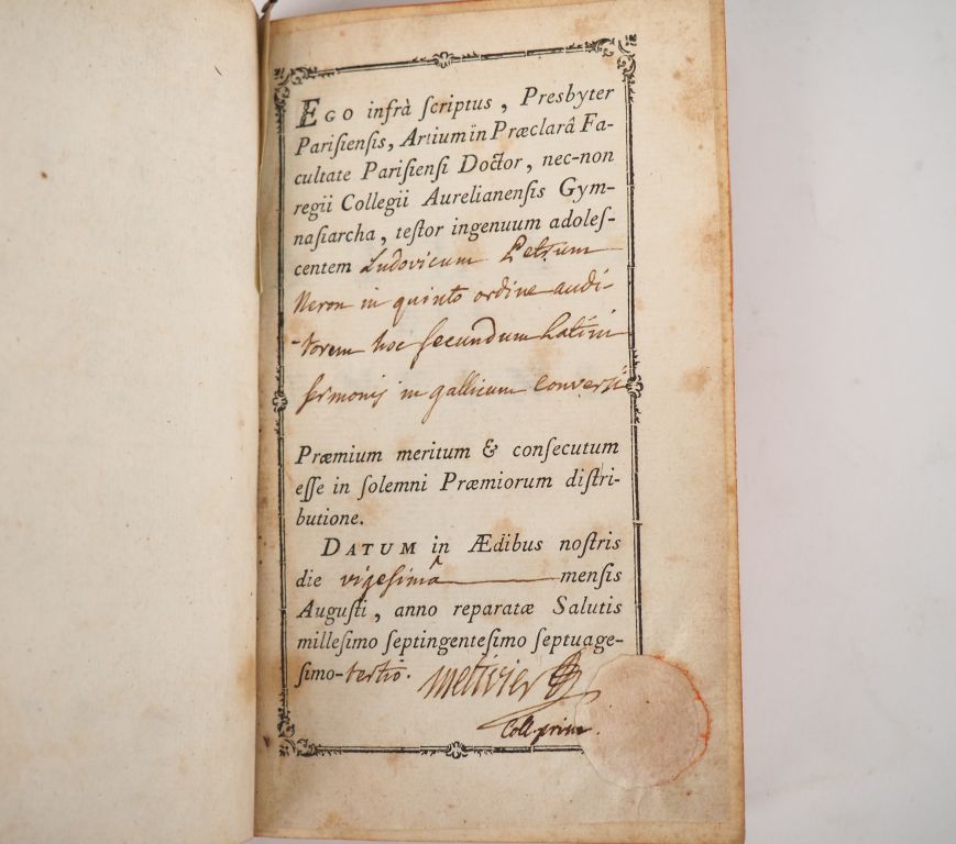 [ATLAS]. ATLAS DES ENFANS, ou Méthode nouvelle, courte, facile et démonstrative, pour apprendre la géographie. En XXII Cartes enluminées. Avec un nouveau traité de la sphère, où l’on explique le Mouvement des Astres, les Systèmes du Monde anciens modernes, l’usage des Globes des Mesures Géographiques. Avec figures. Amsterdam, Schneider, 1760. In-12 veau fauve marbré, plats ornés d’un triple encadrement de filet doré avec armes frappées or au centre, dos à nerfs orné, pièce de titre, tranches rouges (Reliure de l’époque). Coins émoussés. ÉDITION ORNÉE DE 22 CARTES dépliantes coloriées dont 1 carte des Amériques. Le Traité de la sphère relié à la suite contient une page de titre propre et 2 PLANCHES dépliantes coloriées numérotées « 23 » et « 24 » représentant des sphères. BEL EXEMPLAIRE aux ARMES DE FRANCE. ¶ Gumuchian, 388.