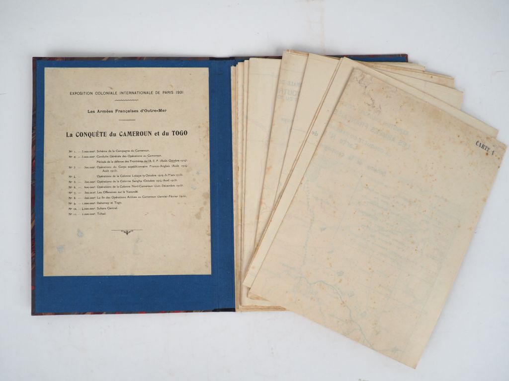 [ATLAS]. CONQUÊTE DU CAMEROUN ET DU TOGO (La). 11 cartes papier pliées et numérotées sous chemise postérieure grand in-4 ½ basane noire muette, étui bordé. RARE ENSEMBLE DE 11 CARTES publiées à l’occasion de l’Exposition Coloniale Internationale de Paris 1931, section Les Armées Françaises d’Outre-Mer.
