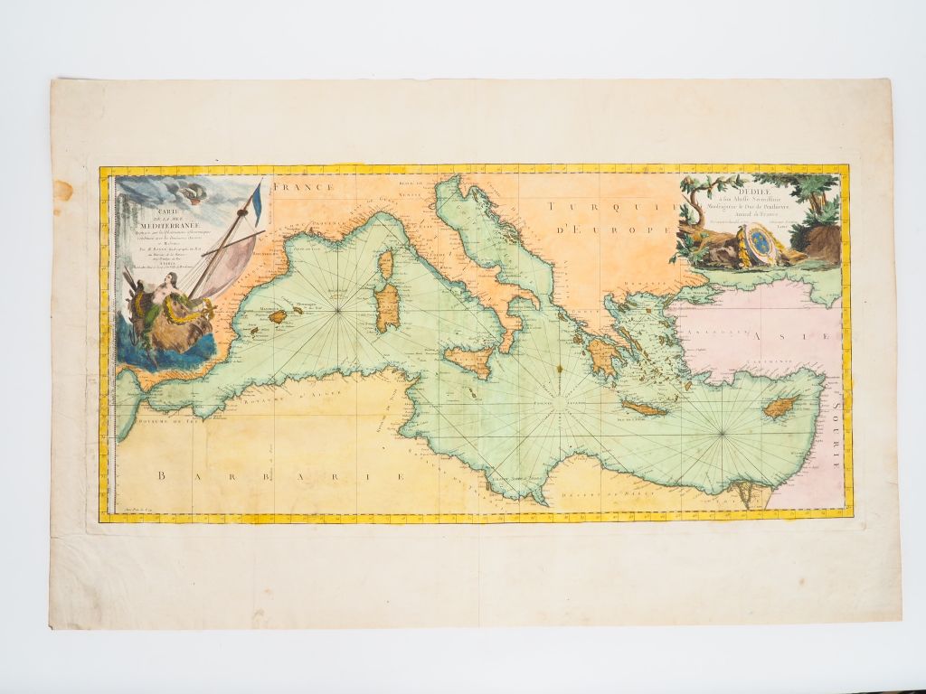 [ATLAS]. ENSEMBLE DE 3 CARTES ANCIENNES SUR LA MÉDITERRANÉE : - FER (N. de). LA MER MÉDITERRANÉE ET LES COSTES DES ESTATS QUI LA BORNE. P., Chez l’Auteur, 1709. Un f. de vergé fort (48 X 80 cm) aquarellé avec cartouche. - JANSON (J.). MARIS MEDITERRANEI. Tabula hydrographica de partibus Orientalioribus. Amsterdam, Janson. Un f. double de vergé (49 X 59,5 cm) aquarellé avec cartouche. Texte hollandais au verso. - BONNE (R.). CARTE DE LA MER appuyée sur les Observations Astronomiques combinées avec les itinéraires anciens et modernes. P., Lattré, [XVIIIe]. Un f. double de vergé fort (48 X 75 cm) entièrement aquarellé avec cartouche.