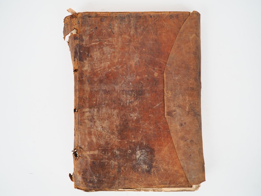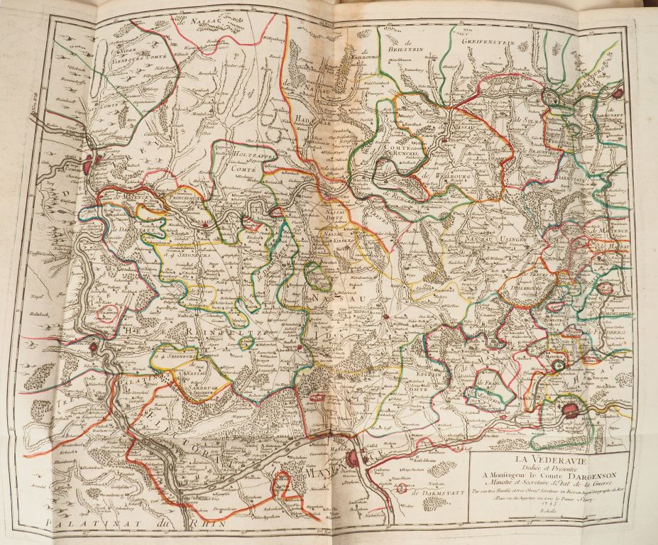 [ATLAS]. [FRICX]. TABLE DES CARTES DES PAYS-BAS ET DES FRONTIÈRES DE FRANCE, avec un Recueil des plans de villes, sièges et batailles données entre les hauts alliés et la France. Bruxelles, Eugène Henry Fricx, 1712. In-folio basane fauve de l’époque , (1) f. de titre, 105 pl. La reliure est ruinée (ne subsiste que la peau qui recouvrait les cartons), mais le corps d’ouvrage est en bon état : quelques brunissures, taches et déchirures. PREMIÈRE ÉDITION de cet IMPORTANT ATLAS composé d’un feuillet de TITRE illustré allégorique, dessiné et gravé par Harrewyn et de 105 CARTES topographiques, plans de villes, forteresses, sièges et champs de bataille. La plupart des planches sont à double page et/ou dépliantes, dont un certain nombre rehaussées à l’AQUARELLE. Elles couvrent les Pays-Bas, la Belgique et le nord de la France et ont probablement été réalisées pour illustrer les guerres qui se sont déroulées dans cette partie du nord de l’Europe. La page de titre annonce 76 CARTES : cet exemplaire est donc considérablement augmenté, notamment de cartes postérieures, certaines datées aux alentours des années 1745 , on trouve également 5 CARTES à double page et aquarellées sur Le cours du Po. EN L’ÉTAT.
