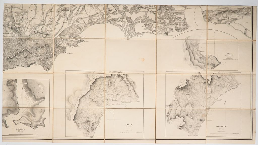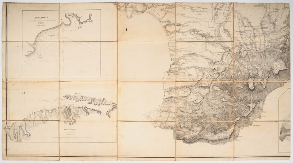 [ATLAS]. KELLY (J. G.) – KING (T. K.). MILITARY TOPOGRAPHICAL MAP OF THE PENINSULA OF THE CRIMEA. Horse Guards, 1854. Quatre parties (chacune 65 X 120 cm environ) entoilées sous étui de basane grenat de l’éditeur, titre The Crimea doré au 1er plat. GRANDE CARTE réalisée d’après une carte russe exécutée en 1816 sous la superintendance du Prince Volkonski.