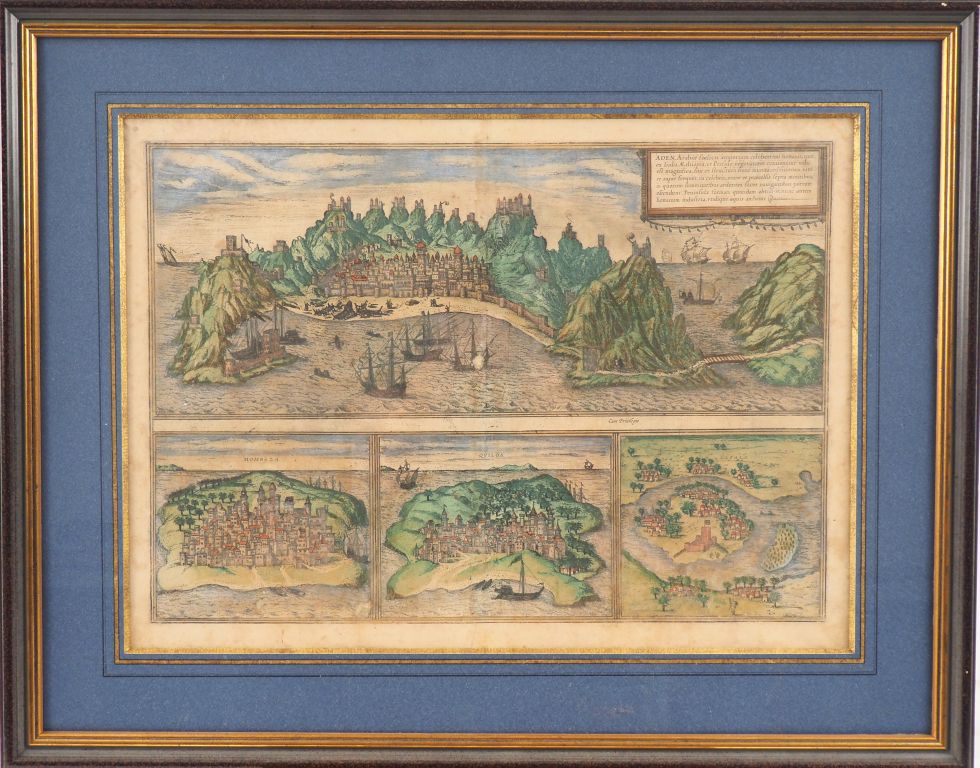 [ATLAS]. PLAN XVIe-XVIIe DE VILLES AFRICAINES en coloris d’époque tirées de l’atlas de BRAUN HOGENBERG Civitates Orbis Terrarum [Théâtre des cités du Monde], publié pour la 1ère fois à Cologne de 1572 à 1617. Plan présenté sous Marie-Louise, verre et cadre en bois. Trace de pliure centrale, quelques rousseurs et taches. - ADEN [Yémen] – MOMBASA [Kenya] – KILWA (Quiloa) [Tanzanie] – SOFALA (Cefala) [Mozambique]. (33 X 47 cm). 4 plans sur 1 f. double.