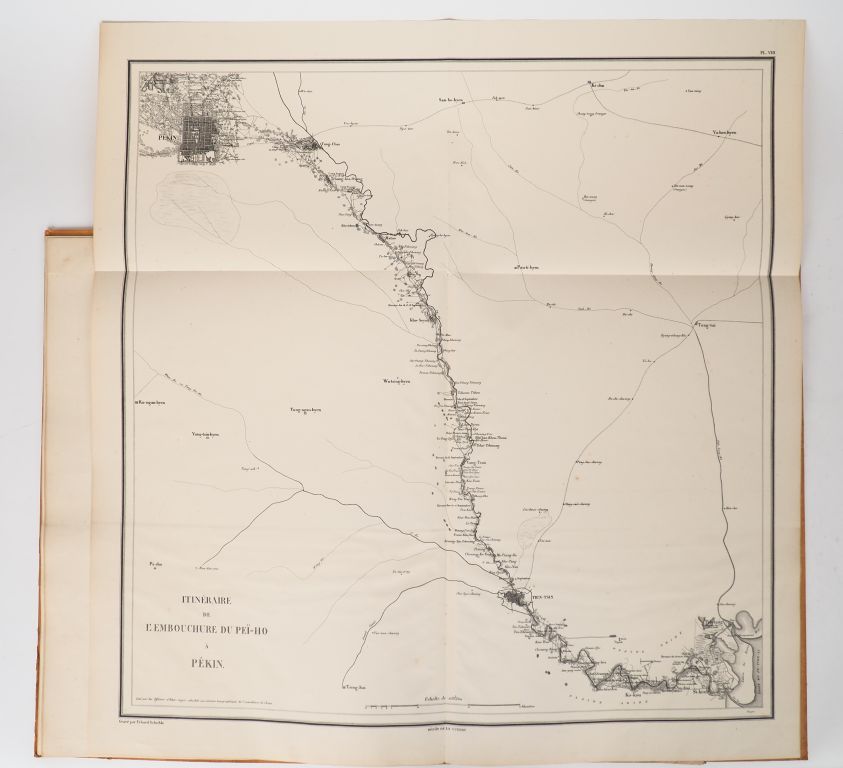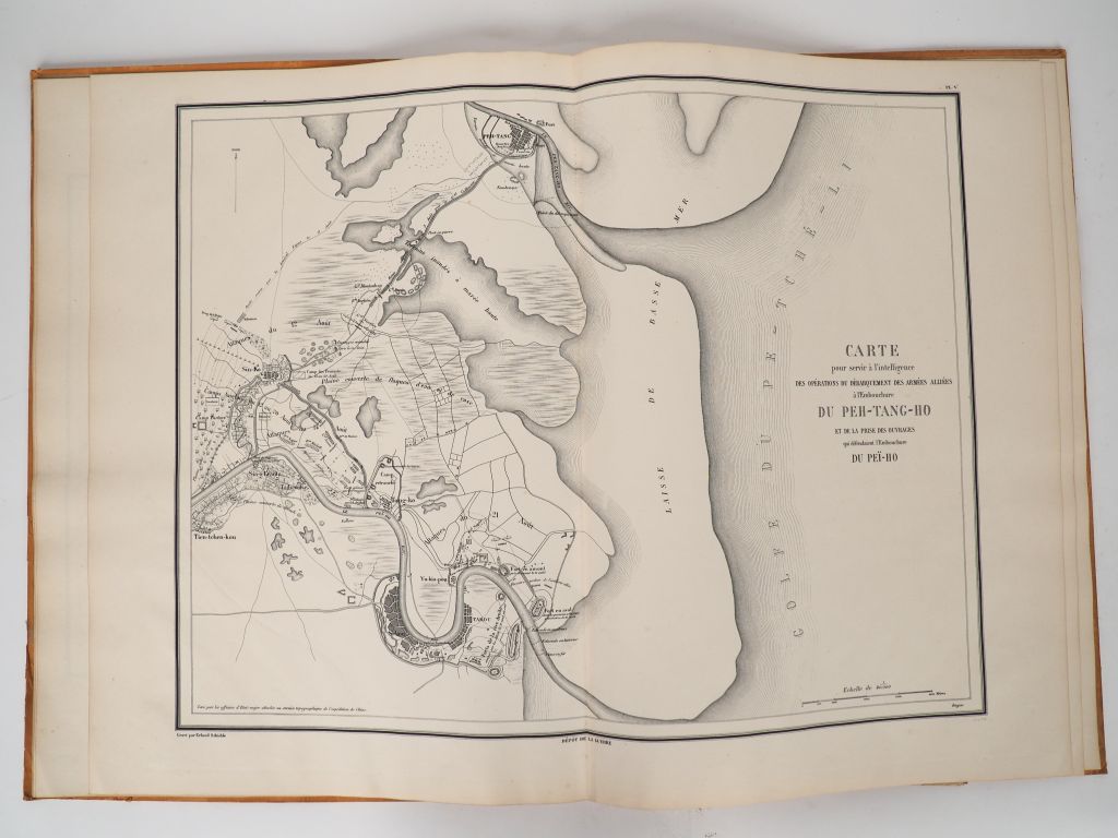 [ATLAS]. RANDON (Comte). ATLAS DE L'EXPÉDITION DE CHINE EN 1860. Dépôt de la guerre, 1861-1862. In-plano ½ toile marron cartonnage éditeur imprimé. Dos en grand partie manquant. RARE ATLAS de 8 PLANCHES numérotées (dont 4 à double-page), gravées par Erhard Schièble. Elles concernent l’expédition de Chine en 1860 qui constitue l'épilogue de la seconde guerre de l'opium, déclenchée en 1856. Ces planches ont été réalisées d’après les documents officiels sous la direction du général Blondel et sous le ministère du maréchal comte Randon. Atlas ENRICHI DE SIX GRANDES CARTES MANUSCRITES en couleurs (encres noire et rouge, crayon de couleur) sur papier libre, pliées et intitulées : Itinéraire de l’embouchure du Peï-Ho à Pékin (73 X 71 cm) – Occupation de Tien-Tsin par la Flotille Anglo-Française le 16 mai 1859 (50 X 38 cm) – Plan du Camp de The-Fon et ses environs (50 X 38 cm) – Prise de canton 28 et 29 décembre 1857 (50 X 38 cm) – Combat de Tchang-Kia-Ouang 18 septembre 1860 (71 X 51 cm) – Carte pour servir à l’intelligence des Opérations de débarquement des Armées Alliées à l’embouchure du Peh-Tang-Ho et de la prise des ouvrages qui défendainet l’embouchure du Peï-Ho (71 X 52 cm).