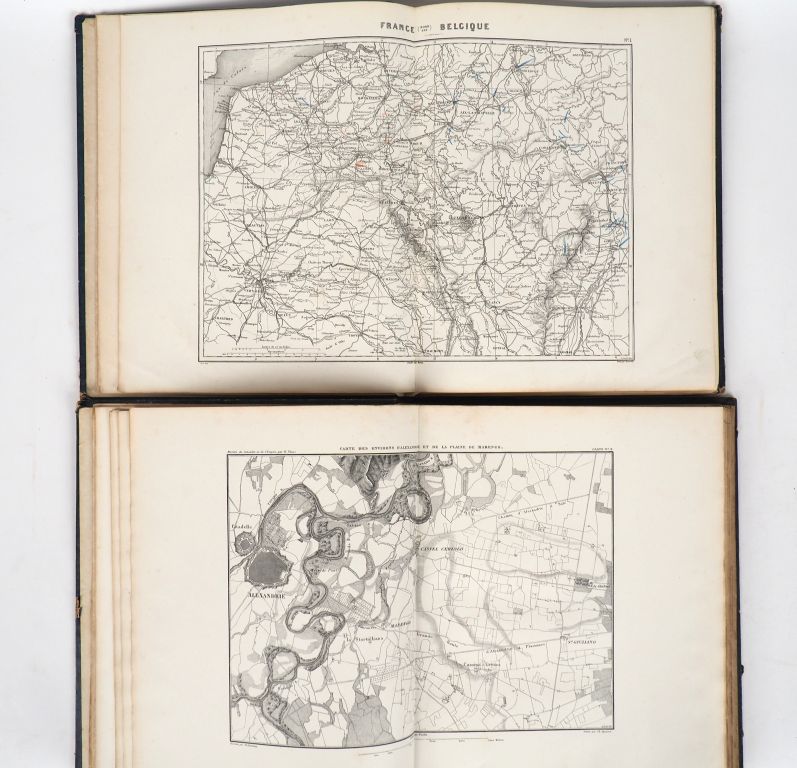 [ATLAS]. THIERS (A.). ATLAS DES CAMPAGNES DE LA RÉVOLUTION FRANCAISE - ATLAS DE L'HISTOIRE DU CONSULAT ET DE L'EMPIRE. P., Furne, Jouvet et Cie, 1866 [circa 1866 pour le 2nd atlas]. 2 volumes in-4 ½ toile maroquinée noire, étiquette de titre au 1er plat (Reliure de l’éditeur). 32 CARTES en noir pour le 1er atlas et 66 CARTES pour le 2nd (dont 62 à double page et 2 rehaussées en couleurs à l'aquarelle), toutes montées sur onglets. Ces atlas sont les complément des volumes de texte des 2 ouvrages d'Adolphe THIERS.