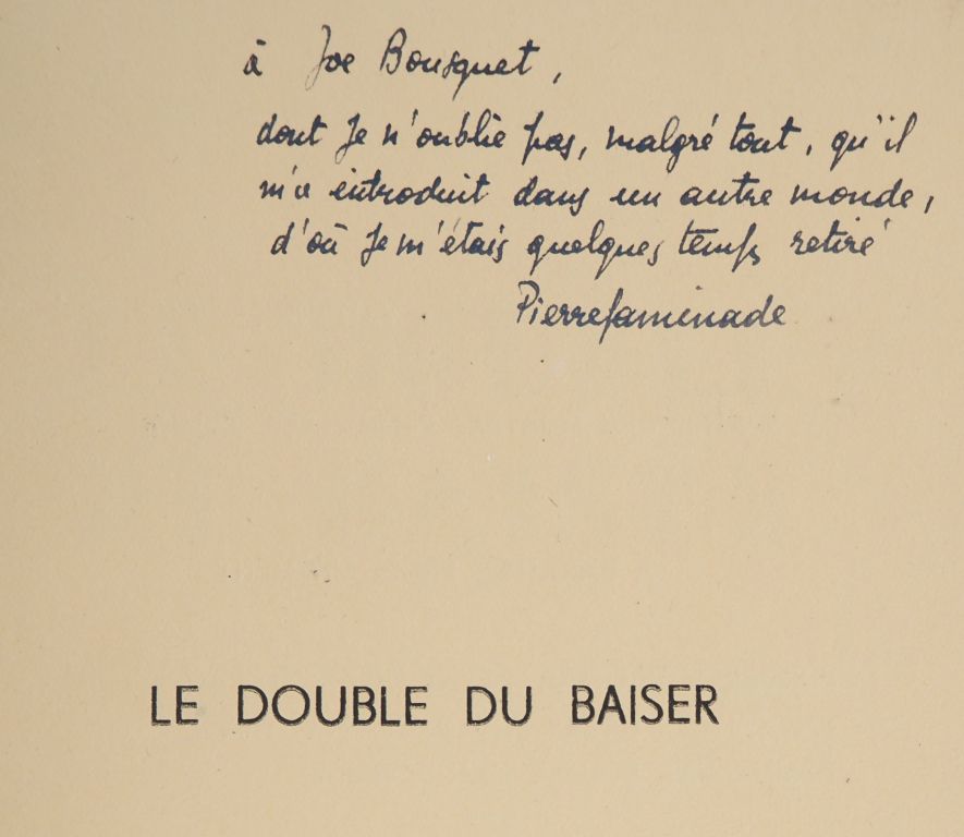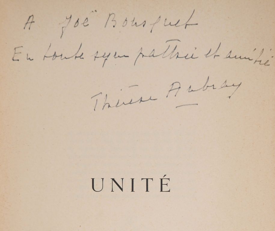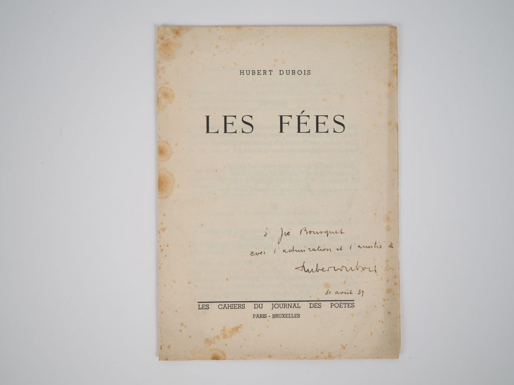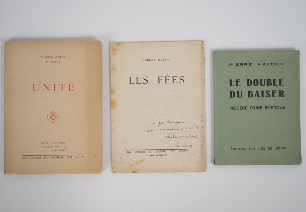 AUBRAY (Thérèse). UNITÉ. Les Cahiers du Journal des Poètes, 1939. In-8 broché. ÉDITION ORIGINALE. Tirage limité à 915 exemplaires. UN des 500 non numérotés sur vélin blanc. ENVOI AUTOGRAPHE signé de l’auteur : « A Joë Bousquet / En toute sympathie et amitié / Thérèse Aubray » – HALTIER (Pierre). LE DOUBLE DU BAISER précédé d’une poétique. S. l. [Cannes], Éditions des Iles de Lérins, 1941. In-12 broché. ÉDITION ORIGINALE de ce recueil de poésies de Pierre CAMINADE (1911-1998), publié sous le pseudonyme de Pierre Haltier. Tirage limité à 65 exemplaires. UN des 60 numérotés sur Algues. ENVOI AUTOGRAPHE signé de l’auteur : « à Joë Bousquet, dont je n’oublie pas, malgré tout, qu’il m’a introduit dans un autre monde, d’où je m’étais quelques temps retiré, Pierre Caminade » – DUBOIS (Hubert). LES FÉES. Paris-Bruxelles, Les Cahiers du Journal des Poètes, [1939]. Un feuillet in-12 plié en quatre. Rousseurs et traces de plissures. ÉDITION ORIGINALE du poète surréaliste Hubert DUBOIS (1903-1965). ENVOI AUTOGRAPHE signé de l’auteur : « à Joë Bousquet / avec l’admiration et l’amitié de Hubert Dubois ». ENSEMBLE DE 3 OUVRAGES dédicacés à Joë Bousquet.