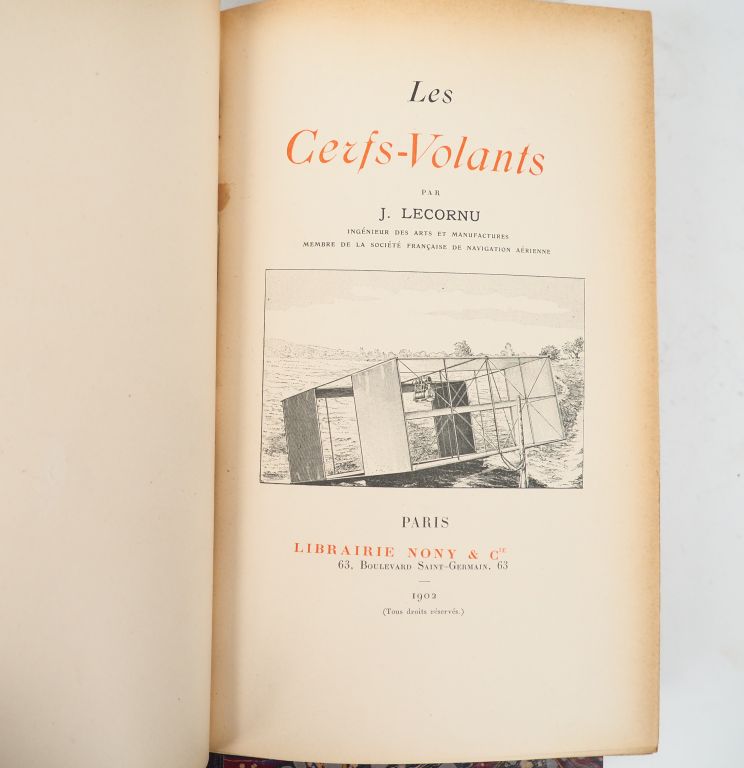 [AVIATION]. ENSEMBLE DE 12 VOLUMES de formats divers ½ chagrin marron, titre doré, plats de la couverture souvent conservés (Reliure début XXe). Épidermures et frottements. - NADAR. LE DROIT AU VOL. P., Hetzel, [1865]. - TISSANDIER (G.). LA NAVIGATION AÉRIENNE. P., Hachette, 1886. - MAREY (E.-J.). LE VOL DES OISEAUX. Paris, Masson, 1890. - LAPOINTE (E.). ESSAI SUR LA NAVIGATION AÉRIENNE. P., Berger-Levrault, 1896. - LECORNU (J.). LES CERFS-VOLANTS. P., Nony, 1902. - POMPEÏEN PIRAUD (J.-C.). ESSAI DE CONSTRUCTION D’UNE MACHINE AÉRIENNE. P., Bernard et Cie, 1903. - BLANCHET (G.). LE VADE-MACUM DE L’AÉRONAUTE. P., chez l’Auteur, 1907. - SAZERAC DE FORGE. LA CONQUÊTE DE L’AIR. Paris-Nancy, Berger-Levrault, 1907. - CHAMPLY (R.). LE MOTEUR D’AUTOMOBILES à la portée de tous. Paris, Desforges, 1907. - TATIN (V.). ÉLÉMENTS D’AVIATION. Paris, Dunod Pinat, 1908. - FERBER (F.). L’AVIATION. Ses débuts – Son développement. Paris-Nancy, Berger-Levrault, juillet 1908. - MICCIOLLO (A.). AÉRONEF DIRIGEABLE PLUS LOURD QUE L’AIR (HÉLICOPTÈRE). Paris, Vivien, 1908. 2ème édition.