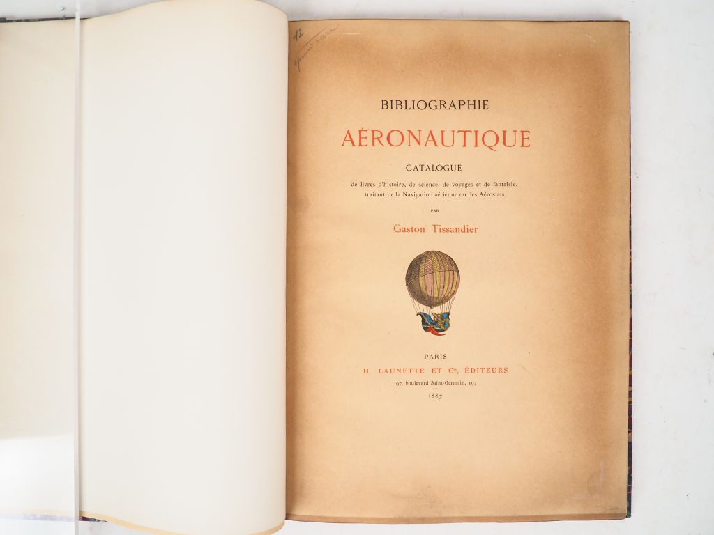 [AVIATION]. TISSANDIER (G.). BIBLIOGRAPHIE AÉRONAUTIQUE. Paris, Launette et Cie, 1887. Grand in-8 ½ chagrin marron, dos à nerfs, titre doré, plats de la couverture conservés (Reliure de l’époque). Frottements, épidermures. ÉDITION ORIGINALE de ce Catalogue de livres d’histoire, de science, de voyages et de fantaisie, traitant de la Navigation aérienne ou des Aérostats.