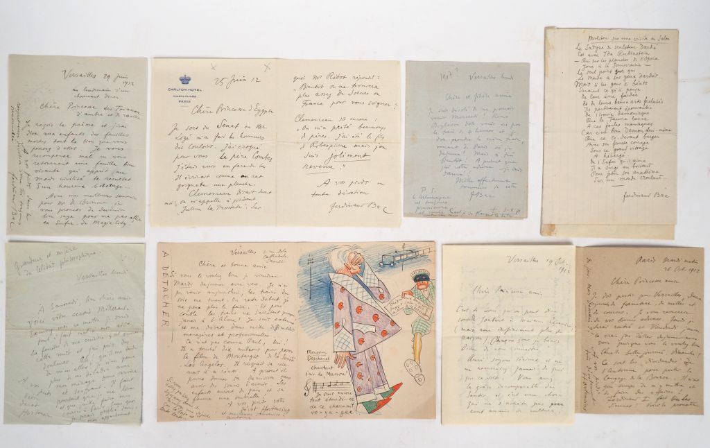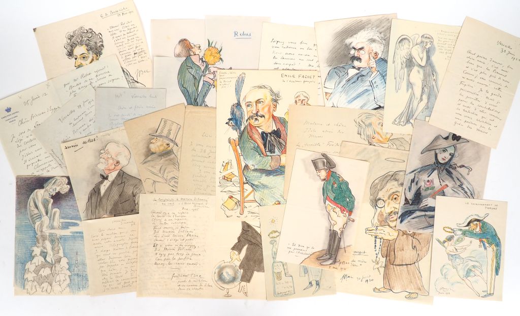 BAC (Ferdinand). LETTRES AUTOGRAPHES ET DESSINS ORIGINAUX adressés par l’écrivain et caricaturiste Ferdinand BAC (1859-1952) à la femme de lettres Renée de BRIMONT (1880-1943). TRÈS BEL ENSEMBLE DE 42 CARICATURES et 15 DESSINS ORIGINAUX offrant un intéressant panorama des personnalités de la IIIe République : hommes politiques, artistes, écrivains, etc. La plupart des dessins ont été réalisés à pleine page à l’encre noire et aux crayons de couleurs. - L.A.S. enrichie d’une CARICATURE du DUC DE SAINT-SIMON (1675-1755). Un f. double (180 X 273 mm), pli central. 1 page de texte : « 16 juin 1711 [1911]. Madame, ne pouvant venir ce soir je dépêche Mr. le Duc de Saint-Simon auprès de vous […] ». - L.A.S. enrichie d’une CARICATURE d’Auguste RODIN (1840-1977), légendée « Le spécimen historique ». Un f. double (136 X 180 mm). 1 page de texte : « 7 août 1911. Madame et chère Divinité, Auguste Rodin m’envoie ce matin une esquisse de son futur Homme primitif qu’il destine à la place de la Concorde où il remplacera l’Obélisque. […] ». Signée : Le voyageur sensible. - L.A.S. 4 août 1911 enrichie d’un DESSIN ORIGINAL figurant Renée de Brimont, à l’allure hiératique, assise sur un obélisque, clamant « Vive l’Empereur » et F. Bac à ses pieds. Un f. double (137 X 180 mm). 1 page de texte. - L.A.S. enrichie d’une CARICATURE de Frédéric MASSON (1847-1923) : « Vive l’Empereur ! 15 août 1911. Broglie (Eure) Ferdinand Bac ». Un f. double (123 X 168 mm). 1 page de texte. - CARICATURE de NAPOLÉON Ier à pleine page ceignant d’une couronne de lauriers une statue égyptienne. F. Bac. 15 août 1911. Un f. (124 X 168 mm). - L.A.S. 20 déc. 1911 enrichie d’un DESSIN ORIGINAL signé : Le pont de Tolède. Un f. double (111 X 172 mm). 1 page ½ de texte. - CARICATURE de Denys COCHIN (1851-1922) : « Le Baron Denys Cochin de l’Académie Française. Le gargotier des Cardinaux. F. Bac / 1 mars 1912 ». Un f. (104 X 135 mm). Joint : carte postale autographe signée qui finit par ses mots : « Voici le sanglier de l’Académie. » - CARICATURE d’Émile COMBES (1835-1921) à pleine page : « Le père Combes au Sénat / 25 juin 1912 / avant la séance où l’on vote les crédits du bicentenaire de J-J Rousseau. F. Bac ». Un f. (168 x 250 mm). Joint : une L.A.S. (1 f. double 124 X 168 mm, 2 pages) 25 juin 1912 : « J’ai croqué pour vous le père Combes. J’étais assis en face de lui. Il écrivait comme un rat grignote une planche. » - L.A.S. Versailles 29 juin 1912 enrichie d’une CARICATURE du comte Joseph PRIMOLI (1851-1927). Un f. double (136 X 179 mm). 1 page de texte. - CARICATURE de Louis DUCHESNE (1843-1922) : « Monseigneur Duchesne de l’Académie française. 11 juillet 1912 / après un bon déjeuner dans sa belle soutane d’alpaga ». Un f. (180 X 272 mm) légendé en marge inférieure. - L.A.S. Versailles 4 oct 1912 enrichie d’une CARICATURE : « Variation sur le Docteur Faust à la manière de Rembrandt… ». Un f. double (136 X 179 mm). Une page de texte. - DESSIN ORIGINAL : « Rembrandt malheureux et délaissé se promène dans la campagne 1661. F. Bac 1912 ». Un f. Canson (151 X 196 mm). Joint : une L.A.S. de 3 pages sur f. double (134 X 180 mm) « 19 oct. 1912 […] Voici joint un vieux Rembrandt pour vous […] ». - CARICATURE d’Étienne GROSCLAUDE (1858-1932). Un f. (135 X 181 mm). « Grosclaude / Retour de chez mélanie 12 oct. 1912 et après un charmant dîner. F. Bac ». Légende en marge. - L.A.S. enrichie d’une CARICATURE de FERDINAND Ier (1861-1948). Un f. double (124 X 168 mm). 1 page de texte. F. Bac 26 oct. 1912. - CARICATURE de Paul HERVIEU (1857-1915). Un f. (125 X 169 mm). « Paul Hervieu / 3 novembre 1912 ». - CARICATURE de Georges de PORTO-RICHE (1849-1930) : « La vieillesse de Don Juan. 17 nov. 1912. F. Bac ». Un f. (189 x 200 mm). Légende manuscrite en marge. - CARICATURE d’Arthur MEYER (1844-1924) foulant au pied un numéro de L’Action Française : Allez dire à Monseigneur que pour toute une vie de dévouement à la Cause du Roy je ne demande qu’une seule chose : « La suppression intégrale de Mr Léon Daudet ». F. Bac. 1912. Un f. (181 X 269 mm). - CARICATURE de Raymond POINCARÉ (1860-1934) : La manière inspirée de M. Raymond Poincaré – La R. F. couronnant R. P. Versailles 17 Janvier 1913 ou du moins Nice (même date) F. Bac. Un f. (170 X 248 mm). - CARICATURE Le Couronnement de Phryné - F. Bac / juin 1913. Un f. double (135 X 180 mm). - CARICATURE : « La manière inspirée de M. Raymond Poincaré – La R. F. couronnant R. P. Versailles 17 Janvier 1913 ou du moins Nice (même date) F. Bac. Un f. (170 X 248 mm). - 4 DESSINS ORIGINAUX, dont 3 signés et datés Talcy 2 oct. 1913. Le Fantôme allant au Pigeonnier – Le Fantôme du château de Talcy – Le Fantôme tenant dans sa main la miniature de Mr et Mad. Suard – L’arrivée du Fantôme. Un f. double et 1 f. (140 X 180 mm) - CARICATURE : Un élégant en 1913. Un f. (124 X 169 mm). - L.A.S. enrichie d’un DESSIN ORIGINAL représentant un canon tirant un cœur : F. Bac. 1 janvier 1915. Un f. double (133 X 203 mm). 2 pages de texte Cannes 31 déc. 1914, signée Hortensius. - CARICATURE de Théophile DELCASSÉ (1852-1923) au globe terrestre : « La Complainte de mossieu Delcassé en exil. F. Bac. Déc. 1915 ». Un f. double (134 X 182 mm). 2 pages de texte : correspondance et poème. - CARICATURE d’Émile FAGUET (1847-1916) : « Émile, lâche tes paperasseries ! le Fricot n’attend pas ! ». [Avant 1916]. Un f. (182 X 270 mm). - DESSIN ORIGINAL Projet pour une amie signé F. Bac Déc. 1917, avec des vers de la Baronne A.[ntoine] de Brimont. Un f. (133 X 207 mm). - L.A.S. enrichie d’un DESSIN ORIGINAL courant sur 2 pages représentant une colombe de la paix sortant sur ressort d’une boîte assortie des mentions : « Très fragile – Importation Wilson et Cie patent ». Un f. double (125 X 158 mm). 1 page d