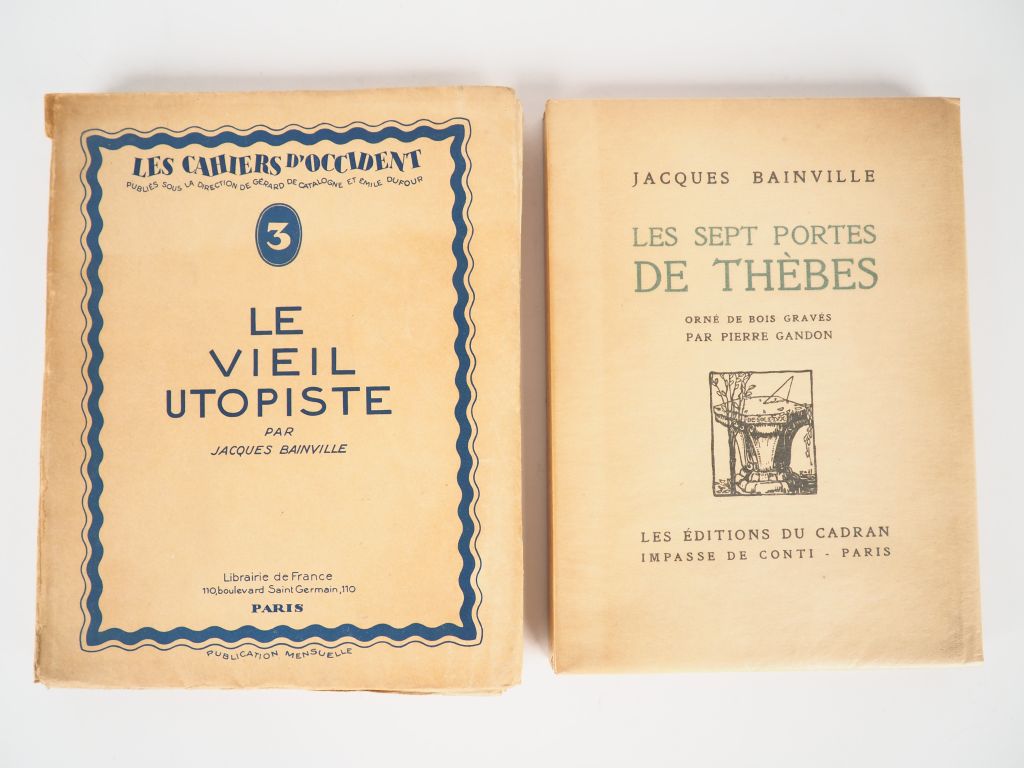 BAINVILLE (Jacques). Les sept portes de Thèbes. Bois gravé par Pierre GANDON, Paris, Editions du Cadran 1931. in-8, broché, sous étui. 1/30 vélin de Hollande. - Le Vieil utopiste. Paris, Librairie de France 1926. in-4, br. Ensemble de 2 volumes