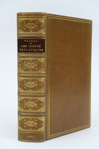 BALZAC (Honoré de). Les Contes drolatiques colligez ez abbayes de Touraine. Cinquième édition illustrée de 425 dessins par Gustave DORÉ. Paris, ez bureaux de la société générale de librairie 1855. in-8. Veau havane clair glacé, double fil. d'encadr., caissons et fleur. dor., pce de titre bordeaux, large dent. int. dor., coupes filetées (Champs-Stroobants). Premier tirage des fameuses illustrations de Gustave Doré. Bel exemplaire, finement relié.