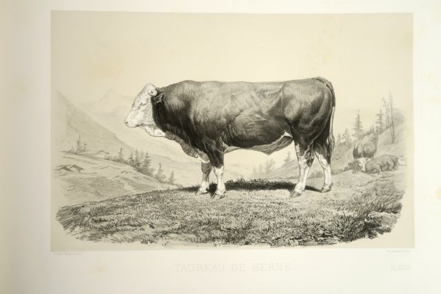 BAUDEMENT (Emile). Les races bovines au Concours agricole de Paris en 1856. Paris, Imprimerie Impériale 1861. in-folio à l'italienne. 1/2 chagrin vert, fil. dor. (Rel. d'époque). Atlas seul, comprenant 87 planches héliogravées reprises en technique mixte par la gravure et la lithographie. Elle ont été gravées d'après des photographies de Nadar, ou des peintures de Rosa et Isidore Bonheur, E. van Marcke, etc. Les vaches sont représentées dans leurs paysages familiers.