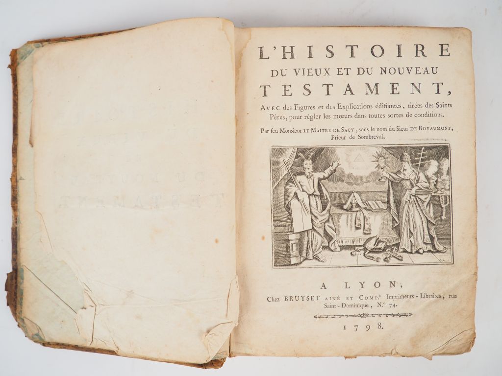 BIBLE DE ROYAUMONT. Histoire du Vieux et du Nouveau Testament. Avec des figures et des explications édifiantes par le Maistre de Sacy. Lyon, Bruyset 1798. Veau. Rel. d'époque, frottée, coins émoussés. Déchirure et manque à 1. f.