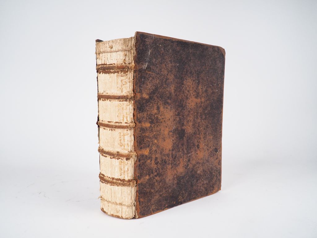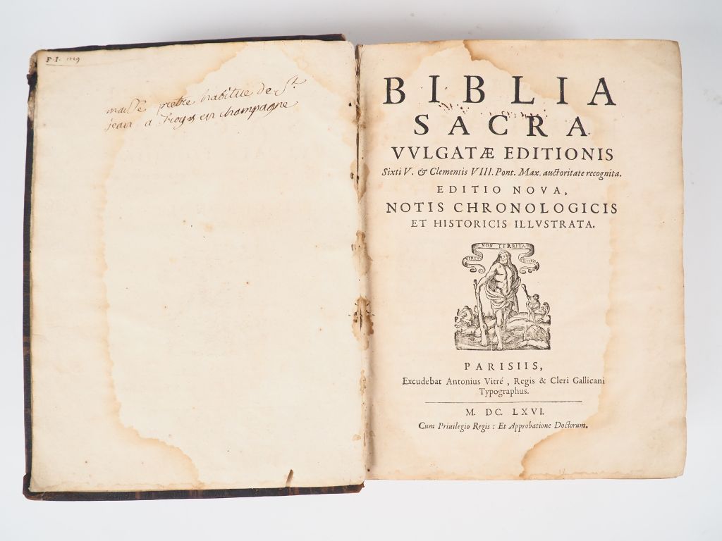BIBLIA SACRA. Vulgatae Editionis. Edition nova, notis chronoligicis et historicis illustrata. Paris, Ant. Vitré 1666. 2 parties en 1 vol. in-4. Rel. d'époque veau. Le dos manque, couture solide. Traces de mouillure. L'une des Bible de Vitré, grand typographe du XVIIème, à qui Colbert confia la direction de l'Imprimerie Royale