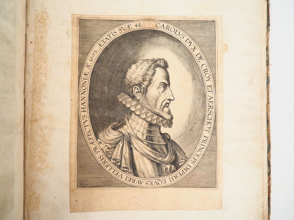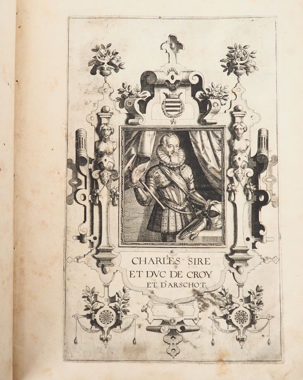 [BIE (J. de)]. LIVRE CONTENANT LA GÉNÉALOGIE ET DESCENTE DE CEUX DE LA MAISON DE CROY tant de la ligne principale estant chef du nom et armes d’icelle que des branches et ligne collatérale de ladicte maison. [Anvers, 1620]. Petit in-folio reliure cartonnée recouverte de papier marbré (Reliure d’attente de l’époque) , (51) ff. + 2 portraits collés sur (2) ff. ÉDITION ORIGINALE très rare de ce recueil hors-commerce, entièrement gravé au burin et à l’eau-forte, exécuté par ordre du duc Charles de CROY, qui prit plaisir à faire représenter ses ancêtres. Notre exemplaire contient 51 feuillets dont le titre, les armes et la devise des Croy, un portrait de Charles de Croy, une légende dans un portique énumérant les nombreux titres de Charles de Croy et 47 PORTRAITS en pied gravés par Jacques de BIE (1581-1640), en belles épreuves. Il a été ajouté in fine 2 portraits gravés dans un médaillon. ¶ Saffroy, 39638, annonce 63 fnch. : « ouvrage fort rare qui ne se présente jamais avec une collation strictement identique. »