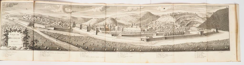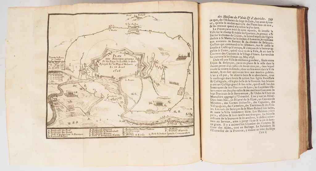 [BOURGOGNE]. DUNOD DE CHARNAGE (F.-I.). HISTOIRE DES SÉQUANOIS ET DE LA PROVINCE SÉQUANOISE [etc.] - HISTOIRE DU SECOND ROYAUME DE BOURGOGNE, DU COMTÉ DE BOURGOGNE SOUS LES ROIS CAROLINGIENS [etc.] – MÉMOIRES POUR SERVIR À L’HISTOIRE DU COMTÉ DE BOURGOGNE [etc.] Dijon, De Fay, 1735-1737 [pour les 2 premiers vol.], Besançon, Charmet, 1740. Trois ouvrages reliés en 3 volumes in-4 basane brune, dos à nerfs orné, pièces de titre et de tomaison, tranches rouges (Reliure de l’époque). Coiffe supérieure du 3ème volume manquante avec atteinte au caisson supérieur, frottements aux reliures, épidermures et petit manque de cuir à une coupe. Cachet encre rouge de bibliothèque religieuse en marge des ff. de titre. ÉDITION ORIGINALE de ces trois ouvrages en reliure uniforme et tomaison commune « I, II et III ». T. I : 9 gravures h.-t. (dont 6 dépl.) – T. II : 9 gravures h.-t. (dont 6 dépl.) – T. III : 1 plan h.-t. dépl. ¶ Saffroy, II-23092 [pour les 2 premiers ouvrages] : « Le tome I traite des abbayes nobles de cette province. » II-23093 [pour le 3ème ouvrage] : « Travail consciencieux que l’historien peut utiliser ».