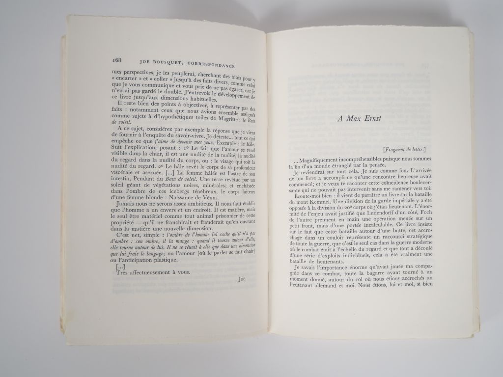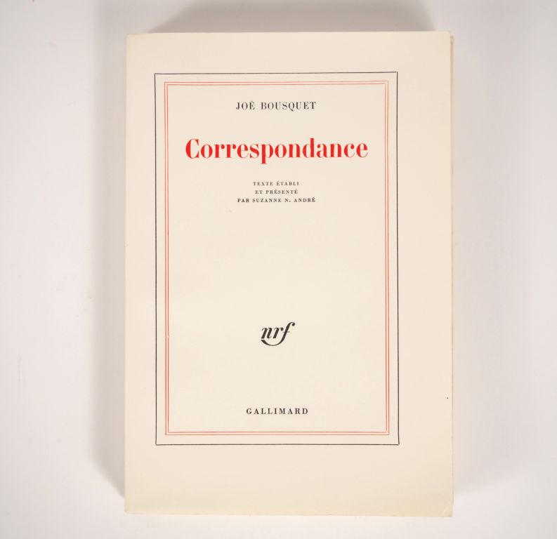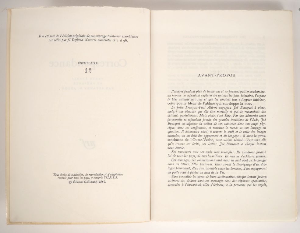 BOUSQUET (Joë). CORRESPONDANCE. Texte établi et présenté par Suzanne N. André. P., Gallimard, 1969. In-8 broché, non coupé. ÉDITION ORIGINALE. UN des 36 exemplaires numérotés sur vélin pur fil Lafuma-Navarre, seul tirage de luxe. Cette correspondance de Joë Bousquet s’adresse à des personnalités du monde de l’art tels que Gaston Bachelard, Lucien Becker, André Breton, André Gide, Francis Ponge, Paul Éluard, Max Ernst, René Magritte, Ferdinand Alquié, René Nelli, etc.