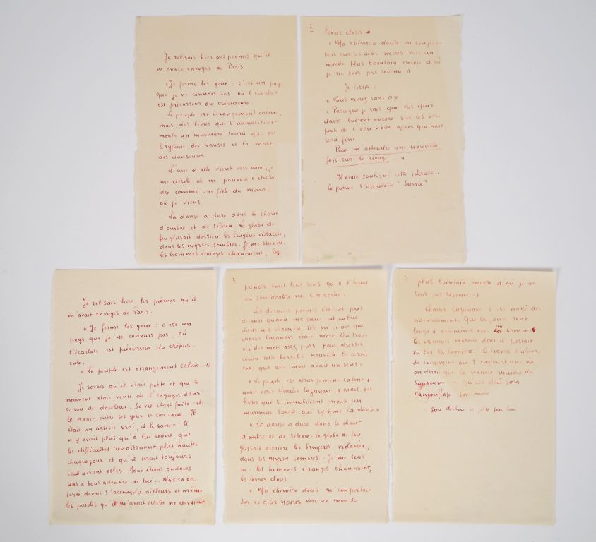 BOUSQUET (Joë). FRAGMENTS AUTOGRAPHES. 5 pages sur 5 ff. (210 X 136 mm). DEUX ÉTATS, l’un de 2 pages, l’autre de 3 pages, d’un même texte rédigé à l’encre rouge. Voici le texte de l’état de 3 pages : « Je relisais hier les poèmes qu’il m’avait envoyés de Paris : / "Je ferme les yeux : c’est un pays que je ne connais pas, où l’écarlate est précurseur du crépuscule." / "Le peuple est étrangement calme…" / Je savais qu’il était poète et que le moment était venu de l’engager dans sa voie de douleur. Sa vie était faite : elle tenait entre ses yeux et son cœur. Il était un artiste vrai, il le savait. Il n’y avait plus qu’à lui redire que les difficultés renaîtraient plus hautes chaque jour et qu’il serait toujours seul devant elles. Nous étions quelques-uns à tout attendre de lui… Mais sa destinée devait s’accomplir ailleurs et même les paroles qu’il m’avait écrites ne devaient prendre tout leur sens qu’à l’heure ou son ombre me l’a caché. / Ses derniers poèmes étaient près de moi quand ma sœur est entrée dans ma chambre. Elle m’a dit que Charles Cazenave était mort. Où trouver des mots assez purs pour dresser contre cette horrible nouvelle la certitude que cette mort avait un sens : "Le peuple est étrangement calme" avait écrit Charles Cazenave "mais, des livres qui s’immobilisent monte un murmure sourd qui rythme la danse" / "La danse a duré dans le chant d’ombre et de silence. Le globe de feu glissait derrière les bruyères violacées, dans les myrtes sombres. Je me suis tu : les hommes étranges chantaient, les lèvres closes." / "Ma chimère docile m’emportait sur ses ailes noires vers un monde plus lointain encore d’où je ne suis pas revenu." / Charles Cazenave s’est noyé accidentellement. Que les jours sont longs à acheminer vers un homme les éléments mortels dont il portait en lui la lumière ! À travers l’absurde évènement où s’engloutit une vie on dirait que la nature rumine des souvenirs – Qu’elle étend son camouflage, son ombre. / Son destin se jette sur lui ». Le 2nde état, constitué de 2 pages, contient de nombreuses variantes. Ces 2 manuscrits ont été insérés dans un fragment de feuillet sur lequel est inscrit à la main : « Dans le manuscrit "Le Passeur s’est endormi" ». Nos recherches ne nous ont malheureusement pas permis de retrouver la présence de ce texte dans le roman de Joë Bousquet…