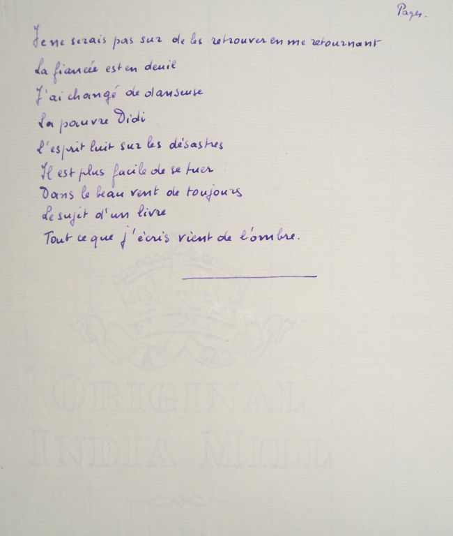 BOUSQUET (Joë). IL NE FAIT PAS ASSEZ NOIR. 150 ff. (27 X 21 cm) de papier vergé filigrané Original India Mill, contenant 1 feuillet de titre, 1 feuillet de faux-titre avec citation, 146 pages de texte numérotées de 1 à 138 (7 pages bis et ter et une page non numérotée entre pp. 48 et 49) rédigées uniquement au recto de chaque feuillet, (3) pages de table des matières. MANUSCRIT DE TRAVAIL COMPLET DU ROMAN DE JOË BOUSQUET PUBLIÉ CHEZ DEBRESSE EN 1932 et dédié à son père, avec 2 chapitres inédits dont un de 12 pages manuscrites. C’est avec ce roman que commence la carrière littéraire de Joë Bousquet. Son roman "Il ne fait pas assez noir" est en effet bien accueilli et des écrivains tels que Carlo Suarès, Jean Cassou ou Paul Éluard se montrent enthousiastes, « frappés par l’originalité de son écriture où les idées se revêtent de chair et les images, d’un poids de pensée, tantôt dans la profondeur des rapports poétiques, tantôt dans le faux air d’imaginaire qui se communique à la réalité immédiate » (René Nelli). Rédigé à l’encre violette, le manuscrit comprend aussi bien des pages sans ratures que des pages contenant de très nombreuses corrections (ratures, ajouts, 4 cartons manuscrits pp. 83, 105, 124 et 125, etc.) , 5 pages sont tapuscrites (pp. 52 à 54, 60, 75) et 2 cartons tapuscrits insérés aux pages 133 et 134, tous ces tapuscrits contenant des corrections manuscrites. Ainsi le manuscrit alterne des pages manifestement réécrites et mises au propre avec des feuillets constellés de corrections qui paraissent de premier jet. Bien qu’il s’agisse du texte définitif, nous avons relevé dans ce manuscrit un certain nombre de différences, plus ou moins importantes, avec le texte imprimé : tout d’abord des variations dans la ponctuation, les intervalles et les rejets de lignes ou de paragraphes. Puis une modification en fin de paragraphe de la page 72 du manuscrit : « Et je me répète en tremblant, désespéré de n’être qu’un homme, qu’au jour levant, pour condamner ma vie, mon bel amour a relevé la sienne. » qui devient page 115 de la version imprimée « qu’au jour levant, pour m’exiler, mon bel amour a relevé sa vie. » Enfin trois suppressions notables dans la version définitive sont à noter. Tout d’abord un paragraphe page 19 du manuscrit n’a pas été reproduit dans la version imprimée (page 92) : « J’attends toujours. J’ai trouvé dans mon cœur l’amour des mains qui se tendront vers les miennes. Mon cœur est assez fort pour m’ôter la force de les saisir. Les mots qui me viennent à la bouche, je craindrais trop que ma voix n’appelât sur eux tout le froid de ma solitude. Ils ne se tournaient pas vers ma vie sans raconter de quelle impossible présence ils me tiennent lieu. » , ensuite le court chapitre IV (13 lignes) de la version manuscrite a été entièrement supprimé : « Si par hasard tu rencontres la vérité, ce n’est pas le tout de l’amadouer. […] La vérité, nous ne saurions l’envisager que corrompue , nos yeux l’ignorent , ou la corrompent en la dévisageant. » , enfin le chapitre IX du manuscrit, constitué de 12 pages (pp. 99 à 110) a lui aussi été entièrement supprimé. On constate ainsi que le texte définitif imprimé est constitué de 10 chapitres et d’une postface alors que le manuscrit comptait 12 chapitres et une postface. En fait Bousquet a nommé 2 chapitres « II » dans le manuscrit , le second chapitre numéroté « II » commençant par « Je m’éveille sous un ciel gris […] » deviendra le chapitre « III » dans la version imprimée tandis que le chapitre III du manuscrit (« L’ombre de cette chambre […] ») deviendra le chapitre IV de la version imprimée. Dans la partie inférieure de la page de titre, on trouve cette énigmatique mention manuscrite : « Lire en le traduisant un texte allemand » , on notera également que la page de titre a été agrémentée d’un bandeau sur lequel Bousquet a inscrit en escalier ces trois mots : « Aimer / Donner / Mourir » , enfin, la dernière partie de l’ouvrage, qui suit le chapitre X, est intitulée dans la version imprimée : « Et la préface ? ... » alors que dans le manuscrit Bousquet n’a pas donné de titre à cette dernière partie et a seulement précisé : « Commencer une page après de très larges blancs ». On trouve des notes manuscrites au verso de quelques feuillets du texte de Bousquet : p. 65 (« Mon regard m’a retranché de ce qu’il voit / Mais mon être est tout ce qui se refuse à mes yeux / Narcisse / Incorporer / associer mon apparence au miracle [etc.] », p. 78 (« le verbe reprend ses droits » [biffé] et enfin p. 138 un long texte biffé : « Te voir et t’aimer, c’est avant tout vivre, et faire la mort et l’hiver dans tout ce qui précédait ta venue, c’est croire en toi, croire que ton âme était assez belle pour créer la mienne et pour en inventer la vie à travers tout [etc.] T’aimer, c’est me quitter, douter au bénéfice de ce que tu me dis de cela même qui tombe au pouvoir de mes sens. » On JOINT la chemise cartonnée du bloc de papier à lettres « Original India Mill » d’où proviennent très probablement les feuillets de ce manuscrit. Elle contient plusieurs mentions manuscrites : « particulier, / particularisation » - « trogne confite » - « après le présent chapitre / cahier noir et / littérature [entouré] / puis / avant [?] / enfin / coffret à cigarettes » et d’autres mentions malheureusement à demi-effacées, difficilement lisibles. IMPORTANT DOCUMENT MANUSCRIT, EN FEUILLES, DE LA PREMIÈRE ŒUVRE LITTÉRAIRE D’IMPORTANCE DE JOË BOUSQUET. ¶ Joë Bousquet, Œuvres complètes, tome I, préface de René Nelli, pp. 79 à 82, Albin Michel, 1979.