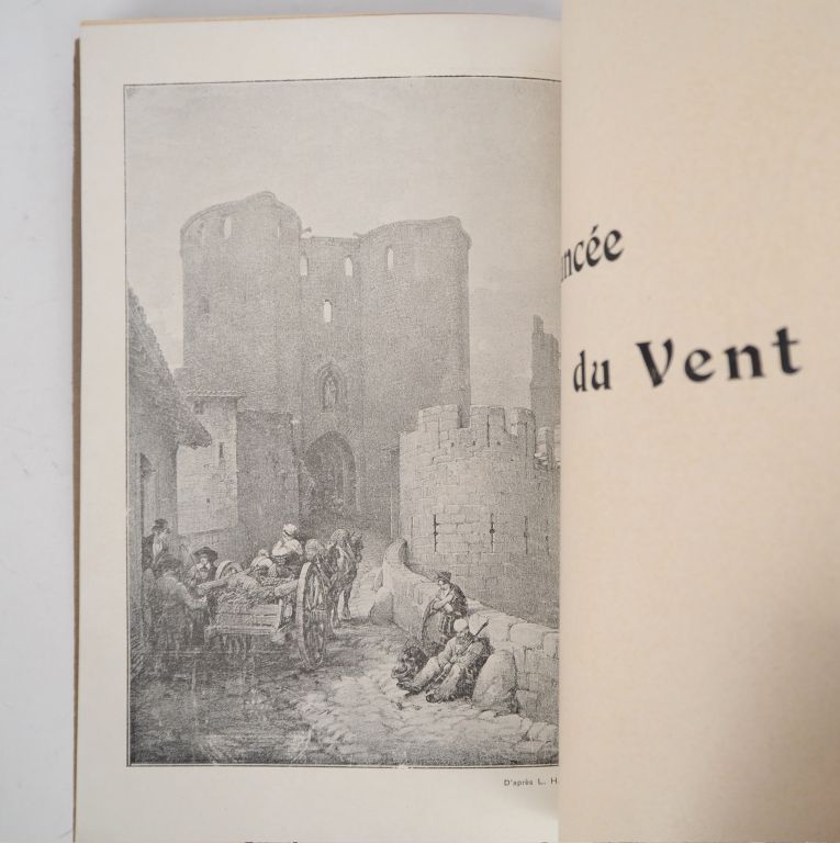 BOUSQUET (Joë). LA FIANCÉE DU VENT. Carcassonne, Imprimerie P. Polère, [Chantiers, 1928]. In-4 broché. ÉDITION ORIGINALE, RARE, du PREMIER LIVRE de Joë Bousquet, paru anonymement. Texte liminaire de 9 lignes signé Jean-Flour Montastruc, pseudonyme de Joë Bousquet. Elle contient un frontispice en noir d’après Louis HAGHE et 4 illustrations hors-texte de Georges CAZENAVE tirées en sépia. Exemplaire non coupé, en parfait état. Au 2nd plat on trouve imprimée la mention : « Dépôt général : Librairie Gallimard / 15, Boulevard Raspail, Paris (VIIe) / Administration : 20, rue du Palais, Carcassonne ».