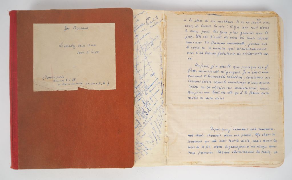 BOUSQUET (Joë). LE RENDEZ-VOUS D’UN SOIR D’HIVER. Deux cahiers in-4 : le 1er ½ toile rouge, plats cartonnés, étiquette papier de titre collée au 1er plat, dos lisse muet , 119 ff. - le 2nd toile maroquinée noire, étiquette papier de titre collée au 1er plat, dos lisse muet , 58 ff. MANUSCRIT DE TRAVAIL COMPLET DU ROMAN DE JOË BOUSQUET PUBLIÉ CHEZ DEBRESSE EN 1933 et dédié à Jean Cassou, l’ami de la première heure. Il s’intitula d’abord "Écoute ma chérie" (mars 1929) avant que Bousquet en adopte le titre définitif le mois suivant. Il s’agit d’un texte extrêmement poétique, décrivant notamment la passion amoureuse qu’éprouva Joë Bousquet pour Ginette Augier qui apparait dans cette fiction sous les traits d’Annie. « Le Rendez-vous d’un soir d’hiver marque un moment important dans la mythologie secrète du poète. Joë va se prendre au piège de l’enfance, parce qu’une enfance est venue qui ressemblait à la sienne. » (Ginette C.-Augier). Ce manuscrit est constitué de 2 cahiers. Le 1er contient une page de titre, 119 pages de texte numérotées de 1 à 118 et une page de table des matières - le 2nd cahier contient un feuillet blanc couvert de notes au verso, 57 pages de texte numérotées de 119 à 176, la dernière constituée de la Table des matières. Rédigé à l’encre bleue, ce manuscrit contient de nombreux cartons, corrections, biffures, ajouts , Bousquet a rédigé sur les seuls rectos des feuillets, tandis que de nombreuses pages en regard du texte sont couvertes de notes qui ont ensuite été biffées. Certains chapitres du manuscrit portent les stigmates plus prononcés du travail de composition et de réécriture de l’écrivain : ainsi dans la 1ère partie le 3ème chapitre, la fin du 10ème chapitre et le commencement du 11ème qui contiennent de nombreux cartons. Le chapitre 4 de la 2nde partie a été également très retravaillé avec de nombreux repentirs, des cartons ayant parfois été collés les uns sur les autres. Le roman comprend deux parties, la première constituée de 15 chapitres, la seconde en comprenant 10. Les gardes des cahiers contiennent de nombreuses notes manuscrites de Bousquet. Sur la 1ère garde du 1er cahier on peut lire, avant qu’elles aient été biffées, les notes suivantes : « Faire évoluer, s’il y a lieu, le sentiment de Paul Servan à travers les horizons infinis qu’il lui découvre : et c’est en vue de cela qu’il faudrait introduire l’épisode du [conte ?] musulman, sur les deux arbres. [Etc.] », puis, en bas de page : « Très important : les paysages ont toujours la couleur des pensées [etc.] » et en regard, cette note jetée en marge de la page de titre : « l’inaccessible, soit dans le temps, soit dans le perfectionnement individuel ». Et sur les gardes du plat inférieur : « 10 septembre : Donner plus de force à cette première partie. Trouver le point où la nudité chante », puis « Le rire est libre comme l’air. Ris tant que le rire est au monde. Et puis, tu aurais beau te débattre avec tes grands gestes d’insecte, de guêpe, tu ne sortiras pas vivant de la maison de porcelaine, parce que c’est la nuit qui t’y a jeté » , et enfin : « Les nuits de rêve où je pleurais en écoutant chanter les hommes ». Toutes ces notes ont été biffées… Les notes sur les gardes du 2nd cahier sont également très abondantes : une liste « fétichisme / masochisme / homosexualité / inceste / narcissisme / masturbation / crime », puis « Le nom de Montségur était un souvenir dans les chansons de ma nourrice [etc.] » ou bien encore « La vie est difficile. On se met comme on peut à la place de son malheur. Et ce ne serait pas assez de baisser la voix. Il y a une nuit dans le cœur pour les yeux plus grande que le jour [etc.] » et enfin : « pourquoi un souci comme le mien passait-il doucement dans la chute des roses qui élevait jusqu’au ciel les paroles d’un air des rues ». Ces notes renvoient au texte imprimé page 202 de l’édition Albin Michel du t. 1 des Œuvres complètes et page 120 du manuscrit : « Je sais que la vie est difficile. Si haut que les jours volent, le vent toujours le même soutient leurs ailes avec de l’ombre. Mais pourquoi un souci comme le mien passait-il doucement dans la chute de roses qui élevait jusqu’au ciel les paroles d’un air des rues ? ». IMPORTANT DOCUMENT, ce manuscrit fixant le texte définitif et permettant de visualiser « le travail en train de se faire », c’est-à-dire la genèse de l’œuvre de Joë Bousquet. ¶ Joë Bousquet, Œuvres complètes, tome I, préface de Ginette C.-Augier, pp. 147 à 153, Albin Michel, 1979.
