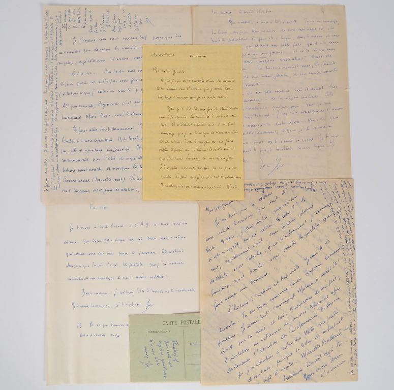 BOUSQUET (Joë). MAGNIFIQUE CORRESPONDANCE INÉDITE ADRESSÉE À GINETTE AUGIER (1912-2001), constituée de 47 LETTRES et d’une CARTE POSTALE. Elle complète la correspondance publiée en 1980 chez Albin Michel, Lettres à Ginette, qui contenait 63 lettres. Tout comme la correspondance publiée antérieurement, ces 47 lettres s’étalent sur une période de 20 ans environ, des années 1930 au décès du poète en 1950. Ce sont ainsi plus de 150 pages d’une correspondance inédite qu’il nous est donné de découvrir, témoignage d’un amour absolu teinté parfois d’une sensualité incandescente « Je pensais à toi, je pense toujours à toi. Je comprenais pourquoi, incompréhensible jusqu’au bout, je pouvais supporter un jour que l’amour d’un homme te rendit femme, te redescendit dans la simplicité vivante de ta chair, moi qui souffre tant de ne te trouver jamais nue qu’à travers les flammes que je porte en moi-même… » mais aussi correspondance intellectuelle dans laquelle le poète fait apparaitre des membres du groupe surréaliste « [Jean] Cassou ? Il est plutôt gros, avec un beau visage, intelligent. Des traits reposés, et il ne porte pas toujours ses grandes lunettes. […]. [Claude-Louis] Estève revient de Paris, où il l’a vu, ainsi que Gala, qu’Eluard, Breton, Ernst… etc. Ce dernier est celui qui insiste le plus pour que je le rejoigne à Paris. » ou s’épanche sur le devenir d’un mouvement artistique qu’il estime condamné « […] le mouvement surréaliste est fini, en tant que mouvement. L’esprit surréaliste est, plus que jamais, entré dans tous les domaines de l’art, et annexé, maintenant, par tant d’écrivains ou de peintres indépendants, se retourne, évidemment, contre Breton, Eluard… L’histoire littéraire rendra à chacun son dû, fera justice de tant de palabres. […] Et une telle vulgarisation de la folie surréaliste (ceci en très bonne part) aide évidemment les détracteurs à dire qu’il n’y a plus de surréalisme… comme il n’y a plus d’aurore, quand il fait jour. Mais le malheur des surréalistes a d’autres causes. Le film, très beau, sur lesquels ils comptaient tant, dans lequel figurait Max Ernst – et tu te souviens que c’est en allant y tenir son rôle qu’il était passé l’année dernière à Carcassonne – ce film, "L’Age d’or" a été interdit. Il y avait un évêque poursuivant une petite fille et dont le fond de culotte – à la fin – prenait feu… Mille autres facéties qui ont justifié (!) l’invasion de la salle par les jeunesses catholiques, et (après une bagarre où l’on a crevé des toiles d’Ernst et de Dali), l’interdiction de passer le film, imposée par la préfecture de police qui n’aime pas les histoires… ». - CHANTIERS / Carcassonne. Ma petite Ginette, Ce que je vois de la tristesse… (2 pp.) - Samedi. Ma chérie. Etait-ce vraiment une dispute ? (2 pp.) - Mercredi soir. Ma chérie : Vite, un mot d’information… (6 pp.). Petit manque en marge inférieure du 3ème feuillet avec perte de quelques mots dont la probable signature de Joë. - Ma chérie. / Je ne sais pas où j’ai mis mon exemplaire de l’Immaculée Conception. [4 pp.]. - 5 novembre. Ma chérie. Je n’ai pas reçu la lettre que tu avais laissée à M. (4 pp.). Petit manque en bas de la marge latérale avec perte de quelques lettres à la 4ème page mais sans perte de mot. - Lundi. Je reprends ma lettre, après ces deux jours… (6 pp.) - Ma chérie. Cassou ? Il est plutôt gros, avec un beau visage, intelligent. (4 pp.). Lettre incomplète : il manque au moins un feuillet… - Ma chérie, Je t’envoie à tout hasard à l’A. G. ce mot qui ne dit rien. (1 p.) - Lundi. Ma chérie / Un dimanche passé dedans tandis que James, … (2 pp.) - Samedi matin. Ma petite chérie. Je t’avais attendue, j’avais comme fouillé… (2 pp.) - Lundi / Ma chérie, ma petite folle, tu sens ton amour-propre atteint… (4 pp.) - Samedi / Oui, mon petit Ginou, j’avais été très atteint… (8 pp.) - Carcassonne, Samedi / Ma chérie / Mais, chiper une lettre, … (4 pp.) - Carcassonne, lundi soir. Ma petite fille tu es là, vivante, devant moi. (2 pp.). Petit manque en marge latérale avec perte de quelques lettres à la 2nde page. - Carcassonne, Jeudi matin. Mon petit Ginou / Et tu n’as pas pensé un instant… (2 pp.) - Carcassonne, 30 décembre. Ce que l’on peut me souhaiter, ma chérie, … (6 pp.) - 25 décembre / Mon petit Ginou chéri… (2 pp.) - Dimanche / Petit Ginou chéri. Je voudrais te dire ma joie. (6 pp.) - Lundi / Ma chérie. Il faisait si bon dans ces ténèbres... (4 pp.) - Mon petit Ginou chéri. Tu as douté de moi, mais je veux que tu... (4 pp.) - Ma chérie. / Je hais trop les gens qui s’emploient à nous séparer … (6 pp.) - Ma chérie / Je t’envoie un mot un peu bref... (2 pp.) - Ma chère petite fille / Enfin ! Je ne t’ai envoyé qu’un mot ce soir. (2 pp.) - Vite, vite, ma grande chérie, tout ce que j’ai à te dire, ... (3 pp.) - Carcassonne, vendredi / Ma chère petite. Malentendu sur malentendu : ... (2 pp.) - Jeudi soir / Ma petite chérie. Brûle la vilaine lettre que tu viens de lire. (2 pp.) - Carcassonne, Il ne faut pas que tu t’inquiètes, ma chérie. (4 pp.) - Carcassonne, vendredi / Mon petit Ginou / Je rouvre ma lettre. (2 pp.) - Jeudi / Mon petit Ginou / Je reçois ton mot : (non il ne manque pas... (2 pp.) - Mon amour, je pense à toi sans cesse. Tu m’as envoyé, tu le sais, des gages… (2 pp.) - Ginette chérie. Un mot, court, mais que je voudrais vivant comme moi-même, ... (2 pp.) - Un mot au galop, mon amour, pour que tu ne sois pas inquiète. (1 p.) avec manque dans l’angle supérieur droit sans atteinte au texte. - Carcassonne, lundi / Ma chérie / C’est une dure épreuve pour le cœur... (6 pp.) - Mon cher petit / Fr. ne peut pas aller à la bibliothèque entre 1 et 4... (1 p.) - Carcassonne, mercredi soir / Oui, mon amour ch