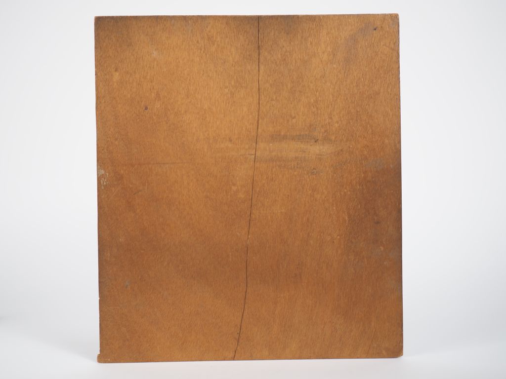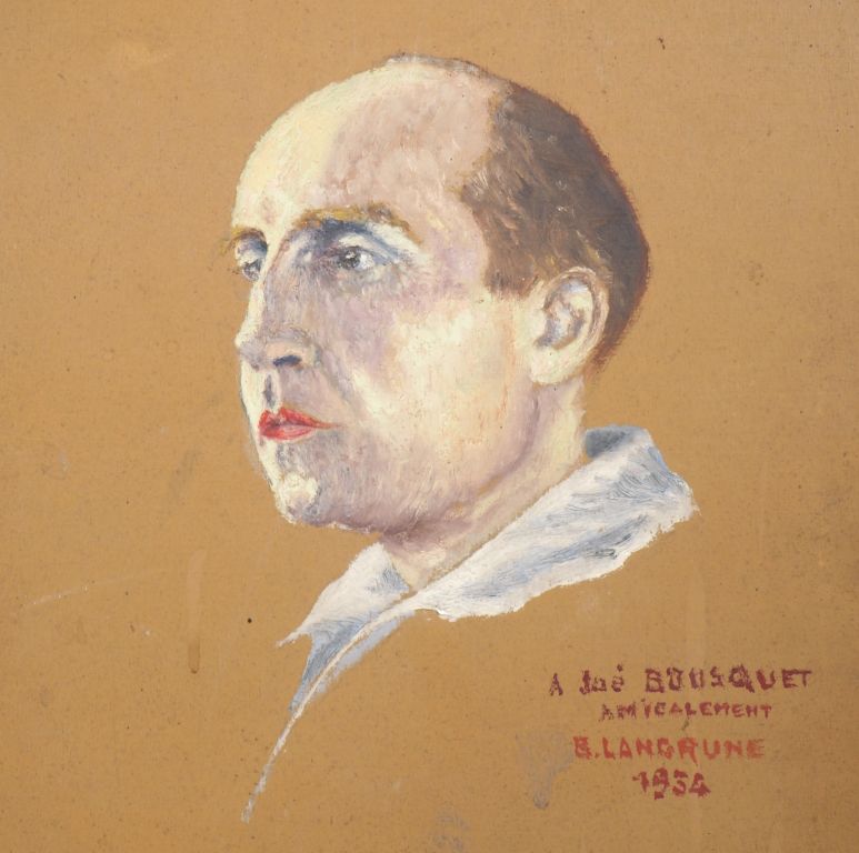 [BOUSQUET (Joë)]. PORTRAIT DE JOË BOUSQUET. Huile sur toile brune collée sur plaque d’Isorel (36,5 X 32,3 cm environ). Fente verticale au verso de la plaque Isorel. BEAU PORTRAIT COULEURS de l’écrivain par le peintre Bernard LANGRUNE (1889-1961). Il contient un ENVOI AUTOGRAPHE sous le portrait, à l’huile, en grenat et rouge : « A Joë Bousquet / amicalement / B. Langrune / 1934 ».