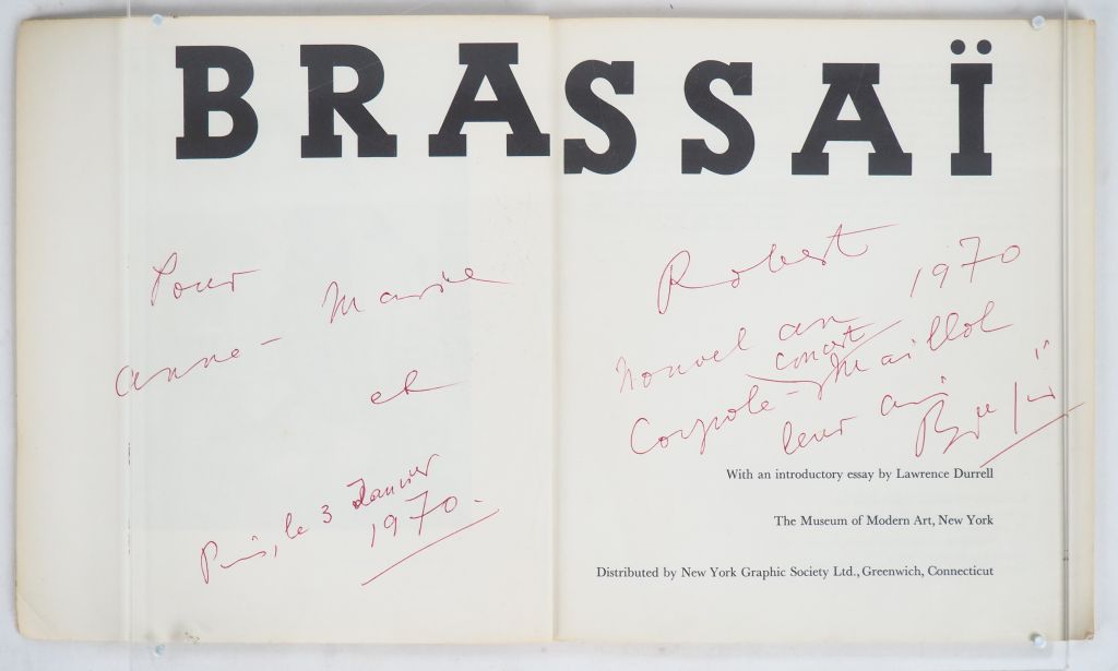 [BRASSAÏ]. BRASSAÏ. New-York, The Museum of Modern Art, 1968. In-4 broché. CATALOGUE illustré de 65 photographies en noir et blanc. E.A.S. à l’encre rouge sur la double page du titre : « Pour Anne-Marie et Robert / Nouvel an 1970 /Coupole-Concert Maillol / leur ami / Brassaï / Paris, le 3 janvier 1970 ».