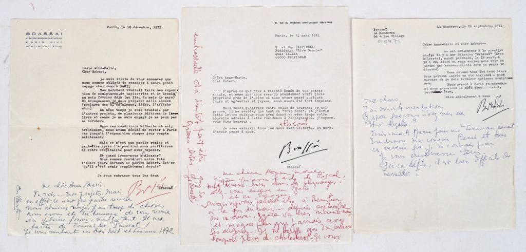 [BRASSAÏ]. ENSEMBLE DE 3 LETTRES TAPUSCRITES SIGNÉES « BRASSAÏ » adressées aux époux Carpinelli. - « La Manderea - 26 septembre 1971 » : 15 lignes tapuscrites + 10 lignes manuscrites de Gilberte Brassaï. - « Paris – 10 décembre 1971 » : 26 lignes tapuscrites + 8 lignes manuscrites de Gilberte Brassaï. - « Paris – 14 mars 1984 » : 13 lignes tapuscrites + 13 lignes manuscrites de Gilberte Brassaï.