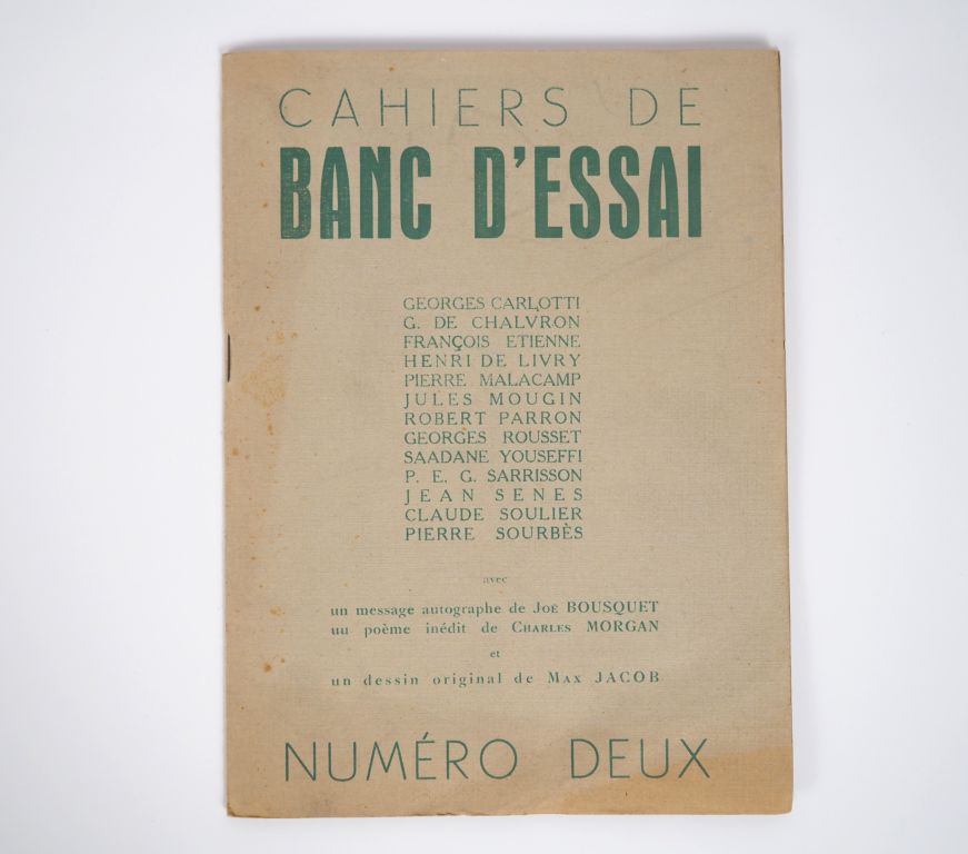 CAHIERS DE BANC D’ESSAI. Numéro deux. Carcassonne, Cahiers de Banc d’essai, décembre 1948. Plaquette petit in-8 agrafée. ÉDITION ORIGINALE de cette rare revue carcassonnaise qui contient notamment la reproduction du texte manuscrit de Joë Bousquet intitulé Message à la jeunesse (3 pages), un poème inédit de Charles Morgan et la reproduction d’un dessin original de Max Jacob.