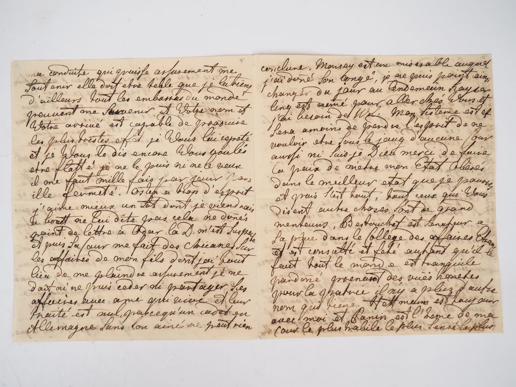 CATHERINE II DE RUSSIE. LETTRE AUTOGRAPHE signée d’un paraphe adressée à Stanislas Auguste Poniatowski. [fin 1762]. 4 pages in-4. IMPORTANTE ET REMARQUABLE LETTRE, RÉDIGÉE EN FRANÇAIS, DE « CATHERINE LA GRANDE », impératrice de Russie de 1762 jusqu’à sa mort en 1796. Écrite quelques mois après le début de son règne, elle est adressée à son ancien amant, STANISLAS II AUGUSTE (1732-1798), grand-duc de Lituanie et futur roi de Pologne (1764-1795), grâce à l’appui de Catherine II et de son ambassadeur à Varsovie Nicolas Repnine. Commencée sur le ton du reproche : « Vous lisés mes lettres avec peu d’attention je vous ai dite et répété que je coure les derniers risque de différens côté si vous mettés les pieds en Russie », la missive de l’Impératrice enjoint le destinataire de ne pas venir la retrouver en Russie : « votre arrivé est capable de produire les plus tristes effet ». Elle évoque son entourage : « Osten a trop d’esprit j’aime mieux un sot dont je viendrais à bout […] la D. [la princesse Dachkov] m’est suspecte et puis la Cour me fait des chicanes sur les affaires de mon fils dont j’ai tout lieu de me plaindre », précise qu’elle a donné congé à ce « misérable » Monsey et envoyé Keyserling en Pologne : « Mon sisteme est et sera a moins de perdre l’esprit de ne vouloir être sous le joug d’aucune Cour […] de faire la paix de métre mon état obérés dans le meilleur etat que je pourres et puis s’est tout, tout ceux qui vous disent autre chose sont de grand menteurs. » Elle évoque ses ministres et conseillers : Alexis Bestoujev, à qui elle a pardonné et qui possède « des vuës honetes pour la patrie », Hettmann qui « est toujours avec moi » et Nikita Panine qui « est l’homme de ma Cour le plus habile le plus sensé le zelé ». Elle ajoute : « je vous peu jurer qu’ils ne font que ce que je leur dicte je les ecoutes tous et je fais mes conclusions moi-même ». Elle assure enfin son correspondant de son attachement : « Adieu soyés assurés que j’aurai toujours une singuliere amitié pour vous et tout ce qui vous touche et laissé moi demeler mes embarras. Si tout les embarras de dix huit ans ou naturellement je devais succomber ce sont reduit a me faire ce que je suis que ne dois-je attendre mais je ne puis point flatter et je ne veux point nous perdre. » Elle ajoute enfin : « j’oubliais de vous dire que Bestoujev aime et caresse beaucoup ceux qui m’ont servi avec autant de zele que la beauté de leur caractere le pouvoit faire attendre. Vraiment ce sont des heros prets a sacrifier leur vies pour la patrie et aussi estimé qu’estimable. » BEAU DOCUMENT, à la fois confession de Catherine II sur sa vision de la situation politique de l’époque et démonstration de son inextinguible volonté de parvenir à ses fins. ¶ Provenance : Ancienne collection Georges Ullmann (7 novembre 2000, n°248) – Femmes, lettres et manuscrits autographes, Ader, (19 novembre 2014, n°267).