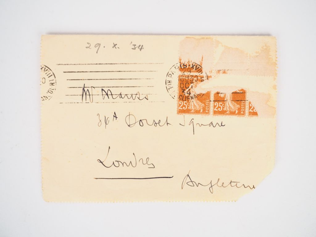 CELINE (Louis-Ferdinand). LETTRE AUTOGRAPHE signée et datée 29 X 1934, adressée à Londres à un ami, Mr Maurs, Carte correspondance timbrée 1p. Céline annonce sa venue à Londres du 1er au 15 décembre "si vous avez une petite amie qui n'a rien à faire je la promènerai volontiers […] Comment va votre voyage ? Et vos affaires ? Et les amours ? Et les cocus ? .."